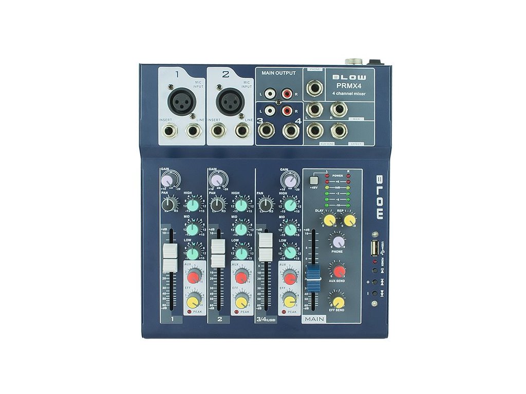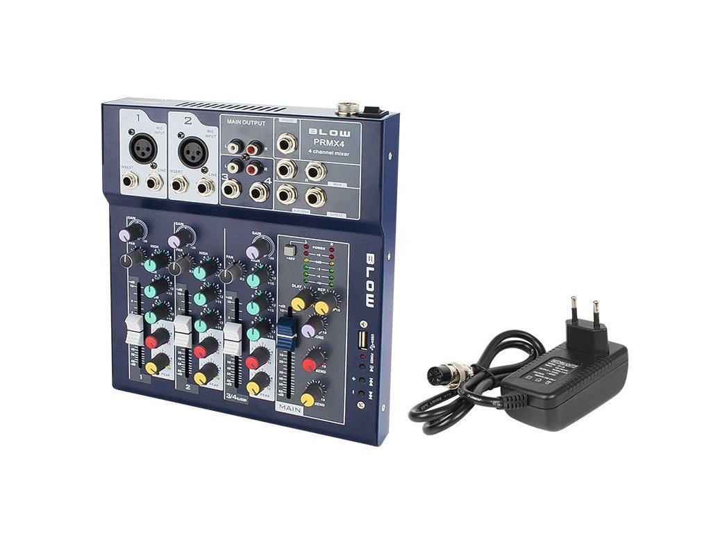 Mixážní pult BLOW PRMX 4 kanálový je ideální pro DJ a nahrávací studia. S integrovaným USB přehrávačem a echo efektem poskytuje široké možnosti ovládání zvuku.