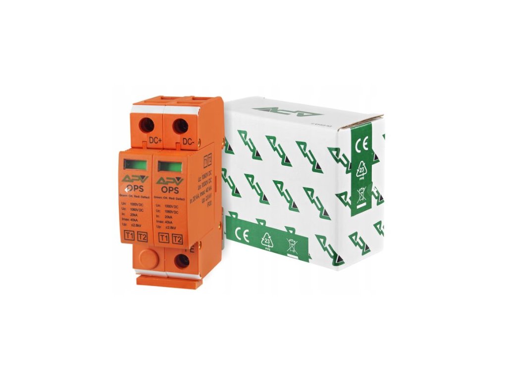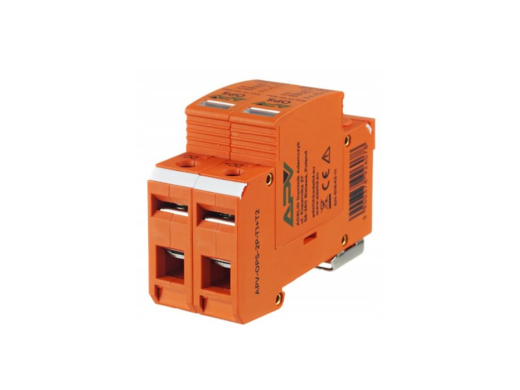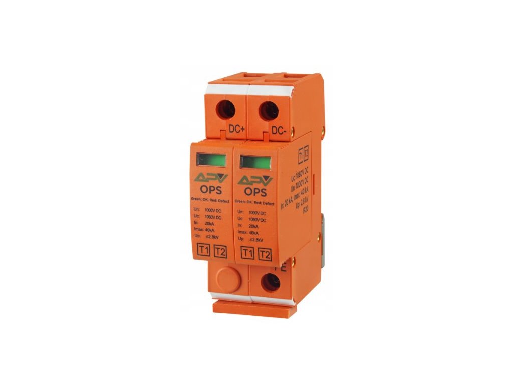 Adelid APV-OPS-2P-T2 je přepěťová ochrana T2 určená pro fotovoltaické systémy, která zajišťuje spolehlivou ochranu s jmenovitým napětím 1000V DC a maximálním proudem 40kA.