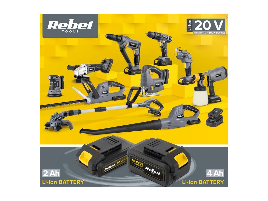Aby vám práce vydržela déle, aniž byste si museli dělat přestávky na dobíjení baterie, nabídka Rebel Tools obsahuje také vyhrazenou baterii 20 V, 2 Ah, která efektivně prodlouží pracovní dobu mnoha zařízení, např. Přídavná baterie je dokonalou zálohou, když se vaše přiložená baterie nabíjí. Díky němu se můžete ještě více zapojit do domácích prací.
