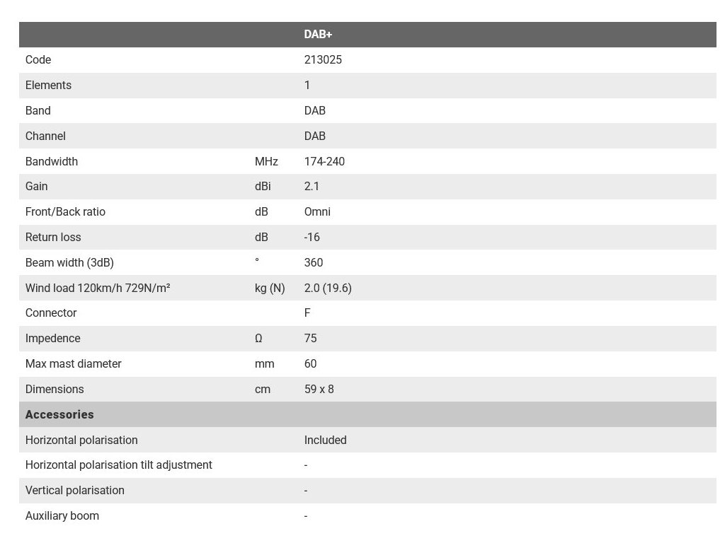 Kvalitní pásmová anténa DAB s konektorem F. Odlišná konstrukce pro příjem digitálních rozhlasových signálů. Vhodná pro instalace STA, TV, SMATV, IRS.