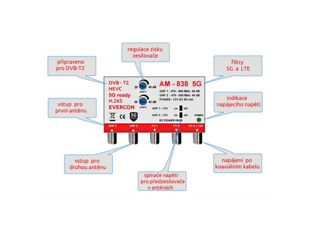 Vlastnosti produktu Anténní zesilovač EVERCON AM-838 5G