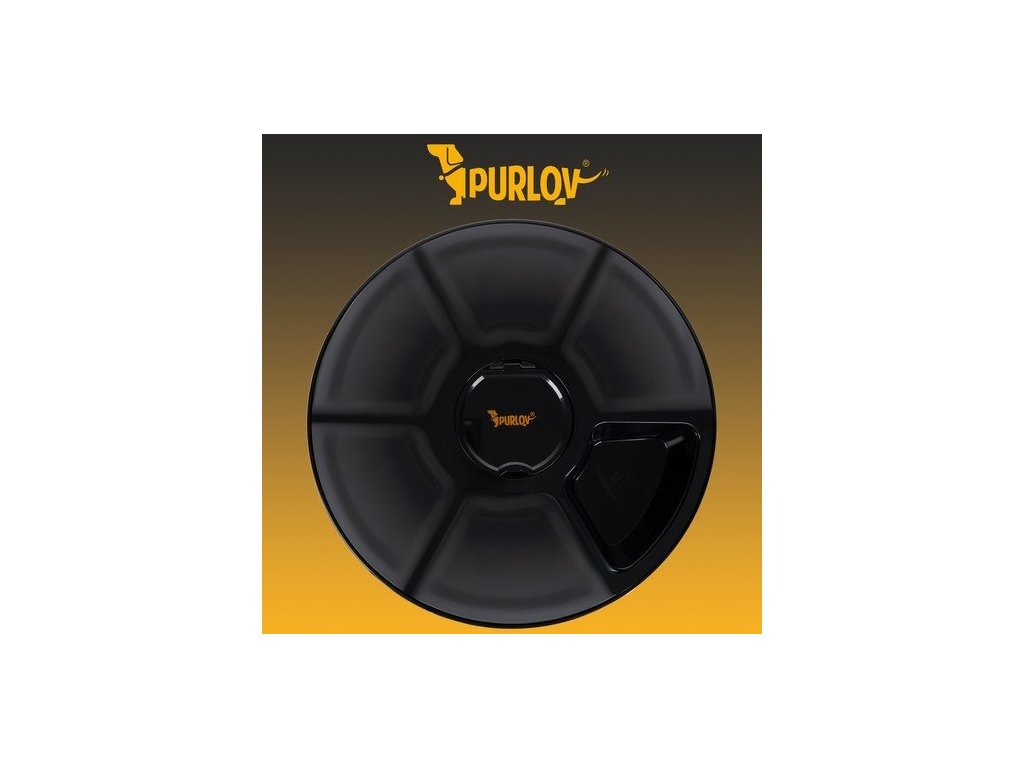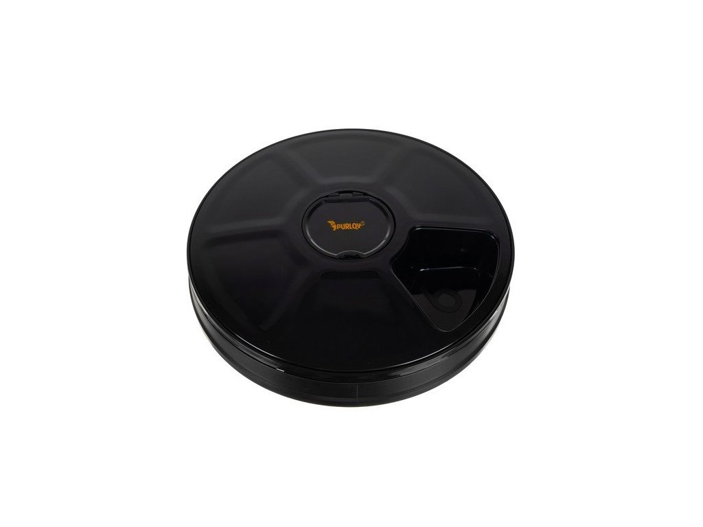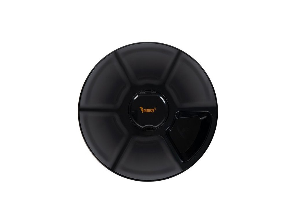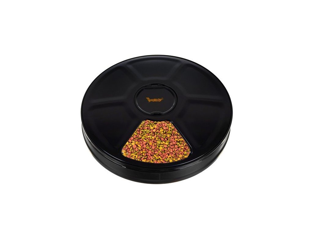 6 KOMOR - mísa má 6 komor o objemu 150 ml každá. 5 je zakryto a jeden je otevřený. Systém časovaného otevírání otevírá jednu potravinovou komoru v určitou dobu, když je víko otočeno.