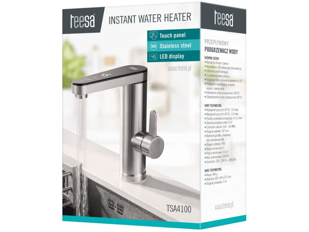 Ohřívač vody Teesa zaručuje dlouholetou spolehlivost. Je vyroben z nerezové oceli 304 odolné proti korozi, je odolný a odolný vůči poškození. Robustní pouzdro a pečlivě zpracované detaily zajišťují nejen dlouhou životnost, ale také esteticky příjemný design, který doplní moderní kuchyně a koupelny.