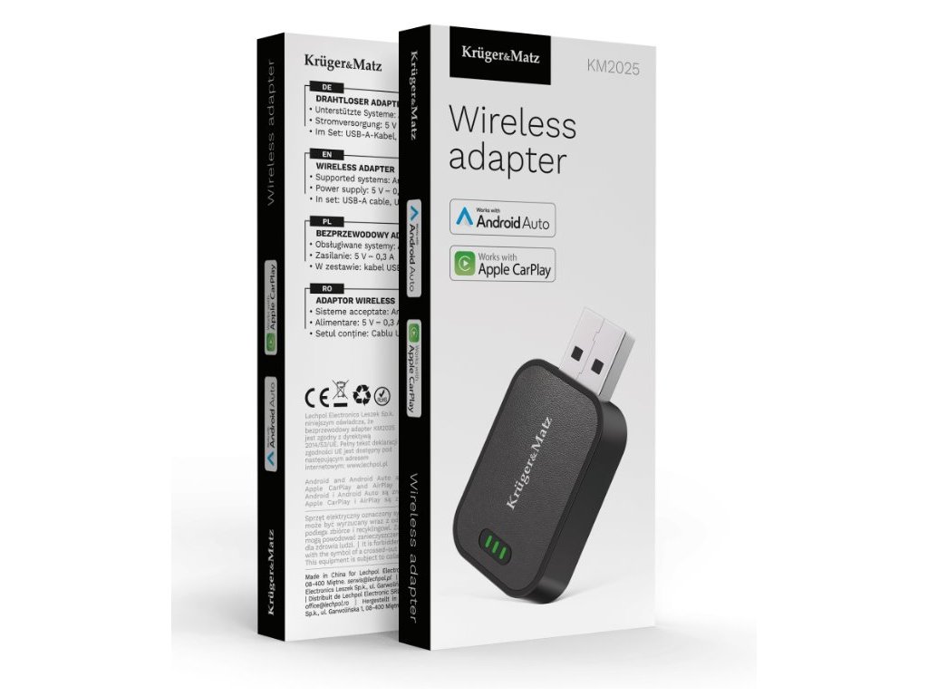 Adaptér Kruger&Matz je kompaktní a moderní řešení, které vám umožní proměnit jakékoli auto v multimediální zábavní centrum. Umožňuje vám připojit chytrý telefon k Android Auto nebo Apple CarPlay bez kabelů, což zajišťuje naprosté pohodlí a bezpečnost během jízdy.