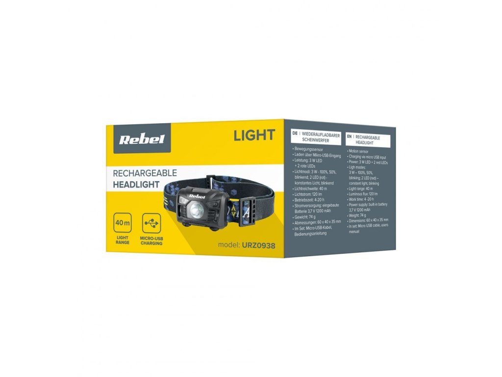 Čelovka REBEL URZ0938 s nabíjecí baterií 1200mAh a výkonem 120lm nabízí optimální osvětlení s dosah 40 m. Ideální pro outdoorové aktivity s různými režimy osvětlení.