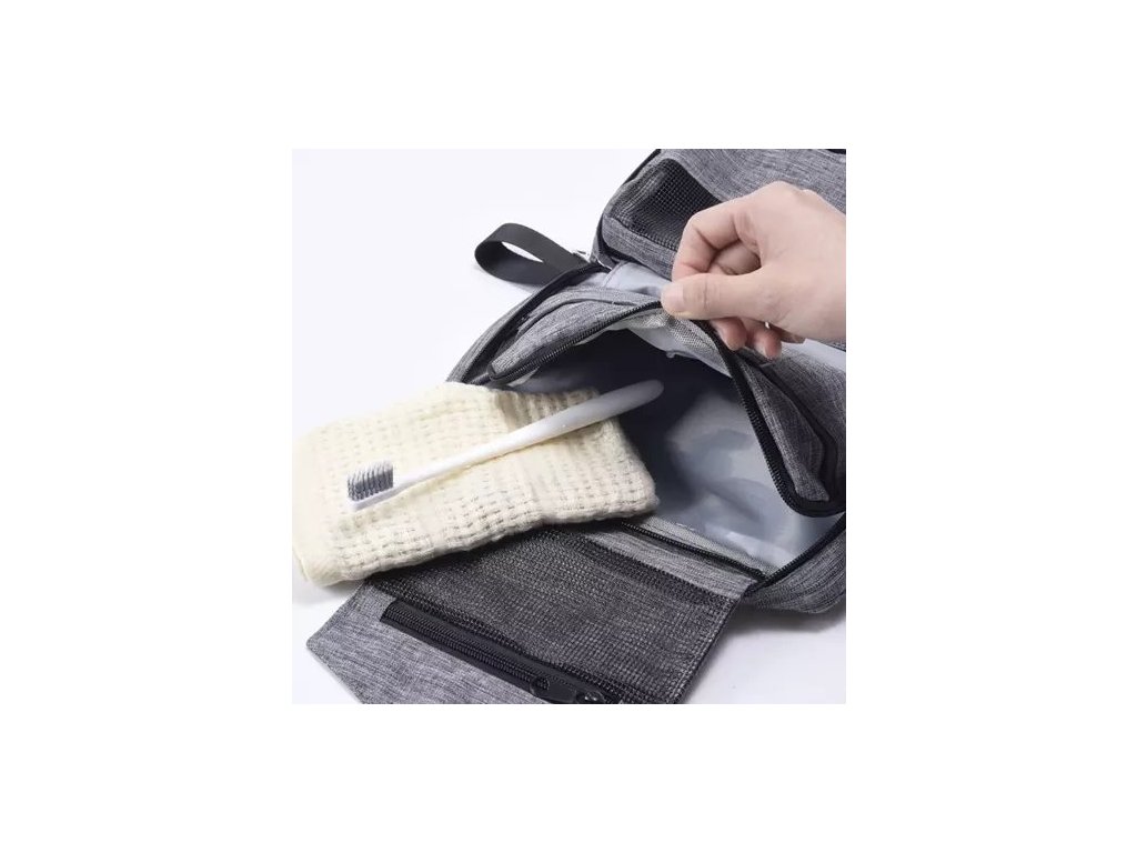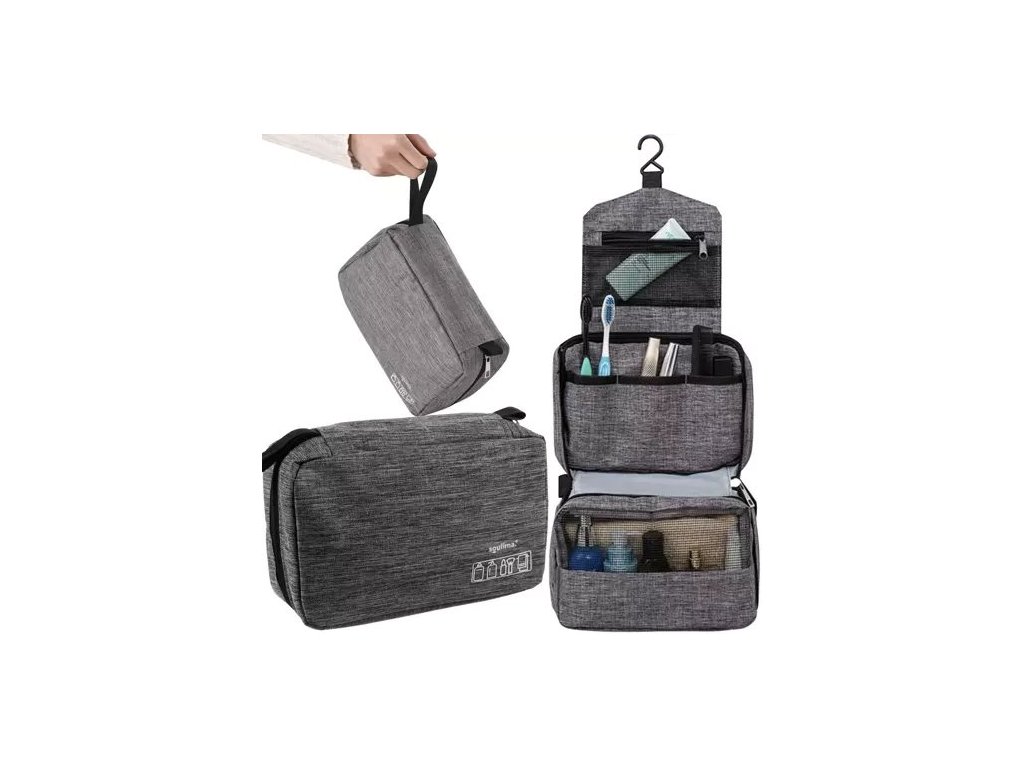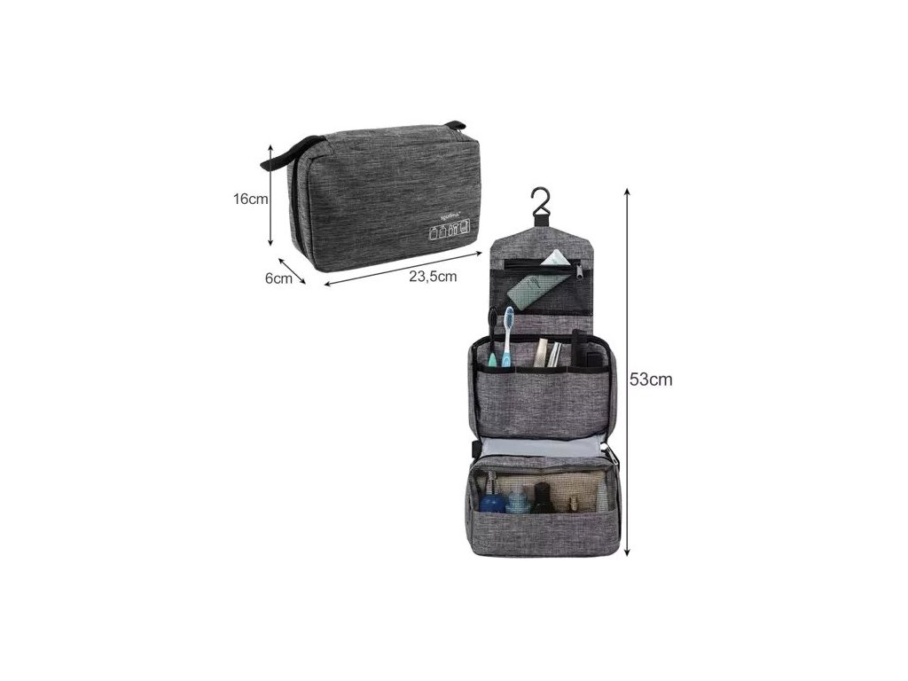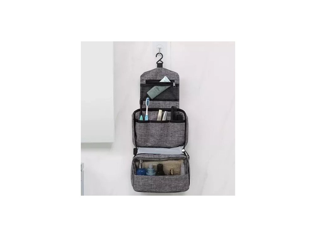 Taška na háček slouží k uložení kosmetiky a kosmetických doplňků na cestách. Je vyrobena z velmi pevného a voděodolného materiálu. Má 3 kapsy a po rozložení je veškeré příslušenství na dosah.