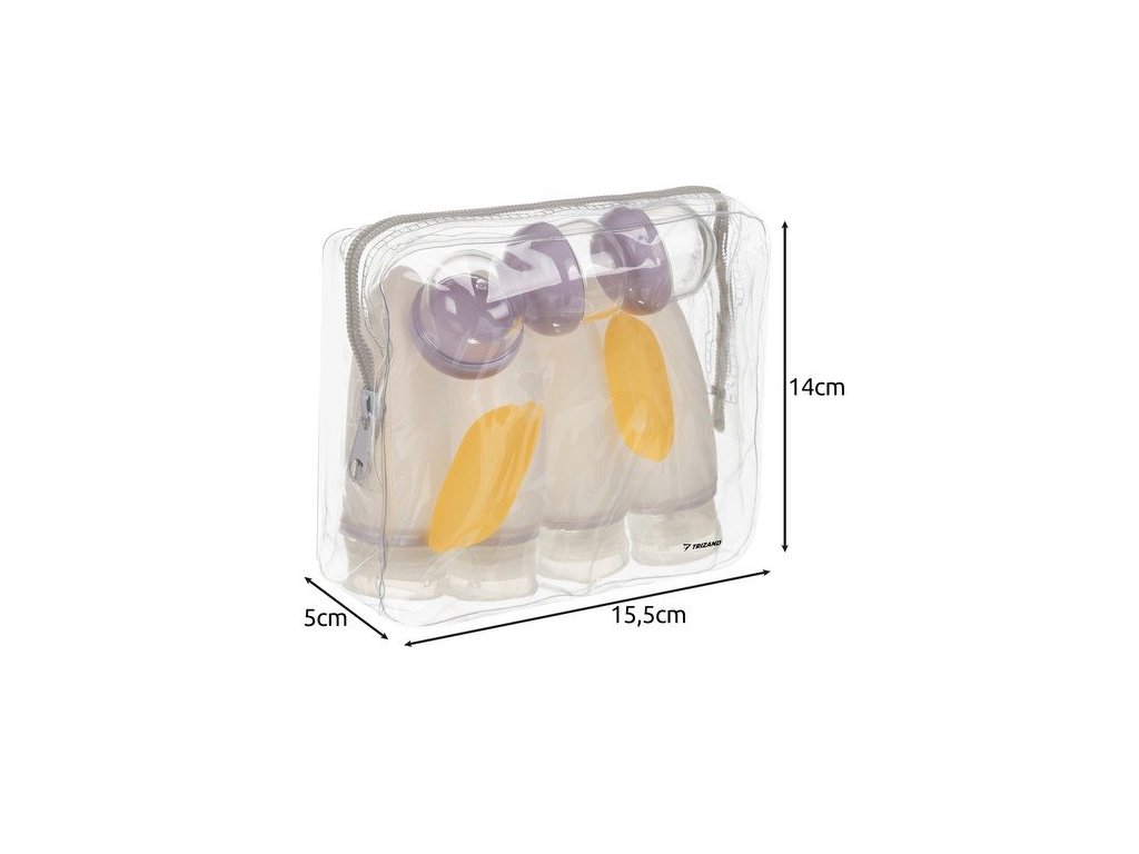 Sada obsahuje 10 prvků. Těsné nádobky pojmou veškerou potřebnou kosmetiku, kterou můžete vložit do průhledné kosmetické taštičky.