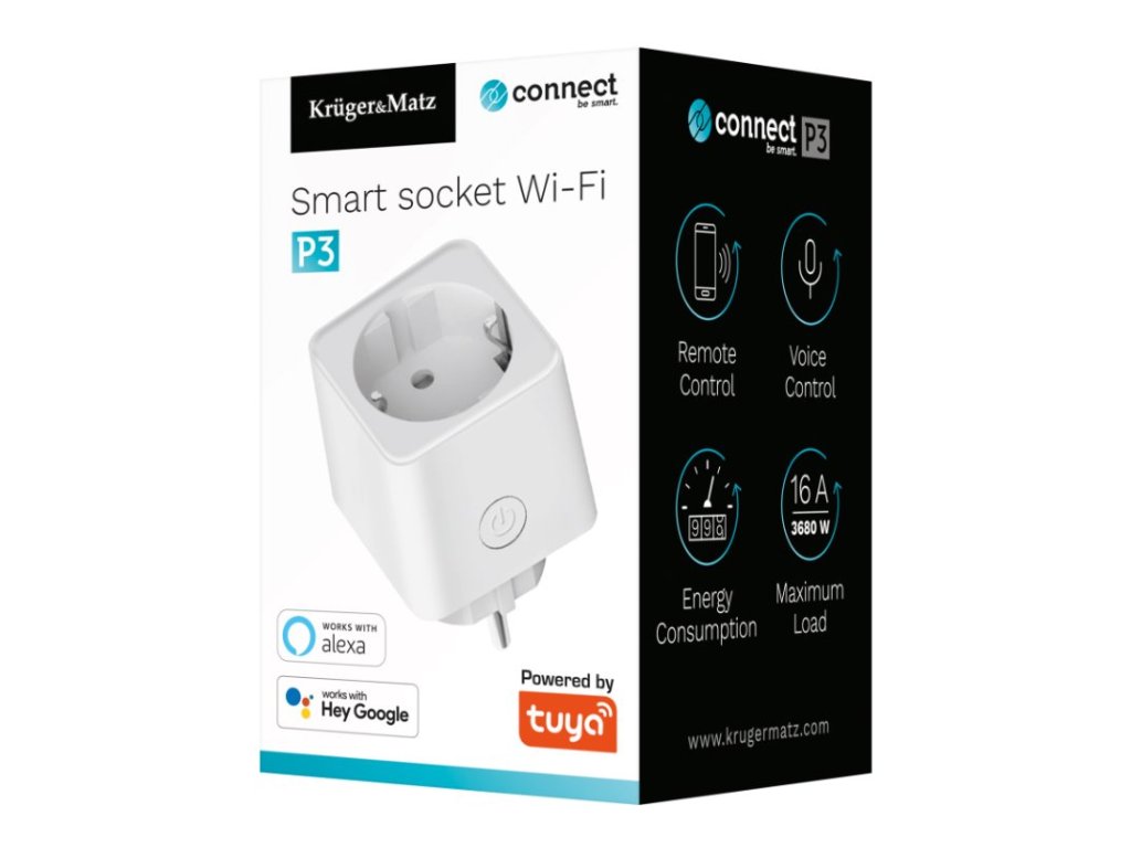 Chytrá zásuvka Kruger&Matz KM2201 Connect P3 nabízí vzdálené ovládání zařízení a měření spotřeby energie prostřednictvím aplikace TuyaSmart. Umožňuje také ovládání hlasem s Google Assistant a Amazon Alexa.