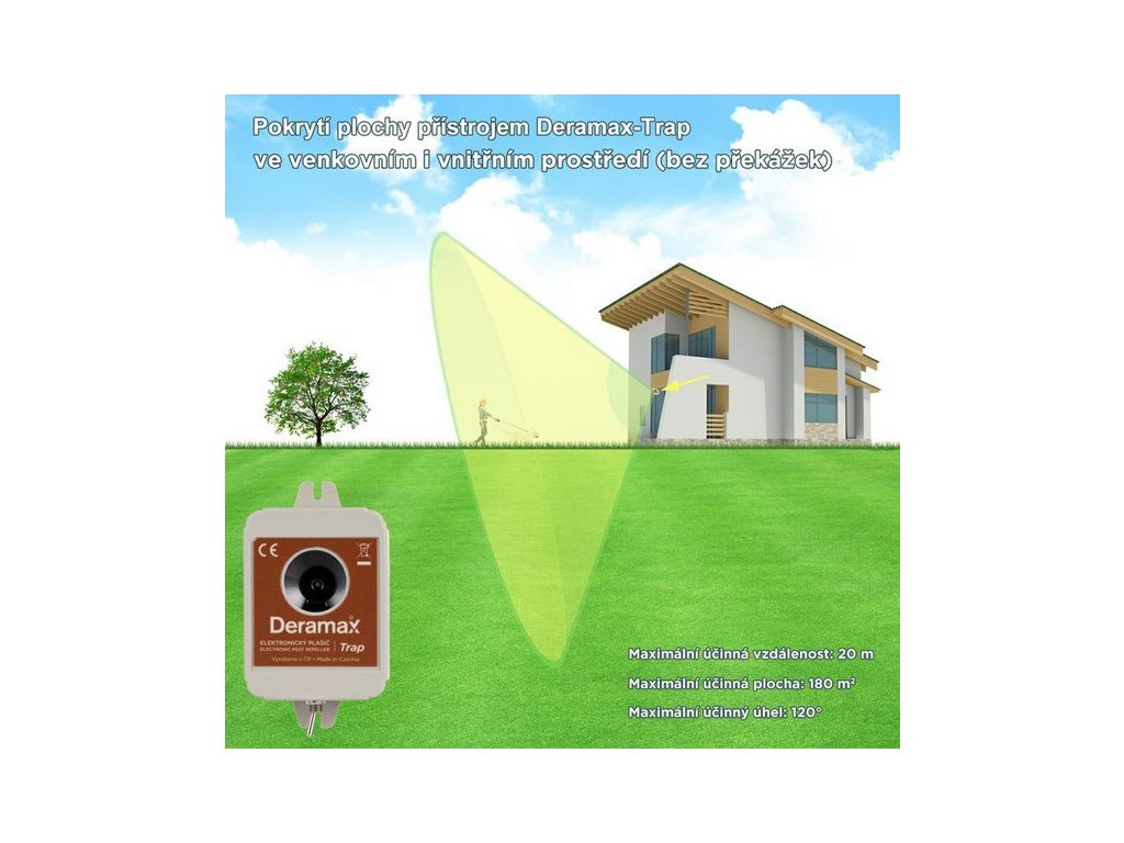 Plašič Deramax-Trap slouží k ochraně vnitřních i venkovních prostorů před kočkami, psy a divokou zvěří (vydry, srnčí, jelení, divoká zvěř, lišky, zajíci). Přístroj je pro člověka zcela bezpečný a bezhlučný. Škůdci jsou trvale obtěžováni ultrazvukovými signály plašiče a v krátkém čase opouští chráněný prostor. Provoz přístroje je ekologický, bez využití chemických prostředků.