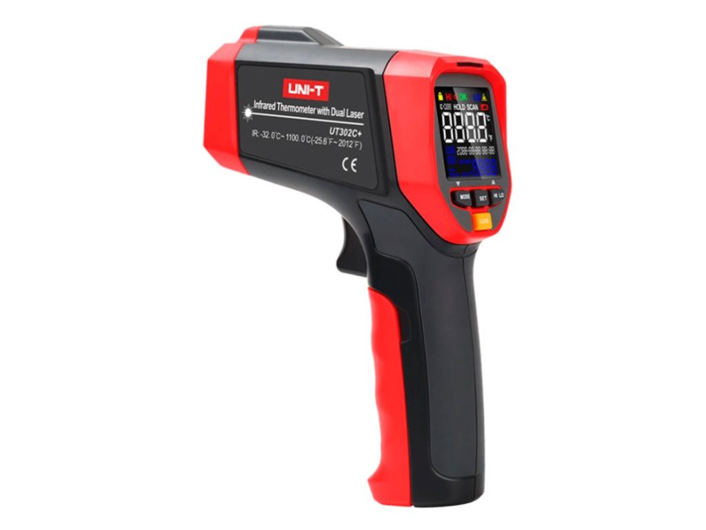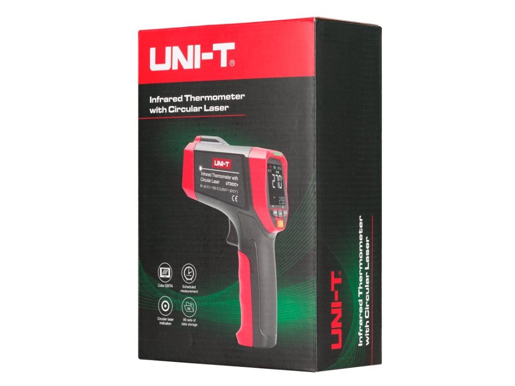 Infračervený teploměr UT302C+ dokáže rychle a přesně určit povrchovou teplotu změřením infračervené energie vyzařované z cílového povrchu. Pro snazší a intuitivní zaměření přístroje na cílový povrch je zabudována jedinečná prstencová laserová indikace zaměření, kterou nabízí u svých přístrojů pouze firma Uni-Trend. Poměr vzdálenosti k průměru měřeného povrchu je u tohoto přístroje 20 : 1. Je možné přednastavit emisivitu měřeného povrchu v rozmezí 0,1 až 1,0 a 5 nejčastěji používaných emisivit uložit do paměti. Indikaci přednastavených funkcí a naměřených hodnot zajišťuje jasný a kontrastní EBTN barevný displej a hraniční hodnoty indikují LED diody červená, zelená a modrá a bzučák.