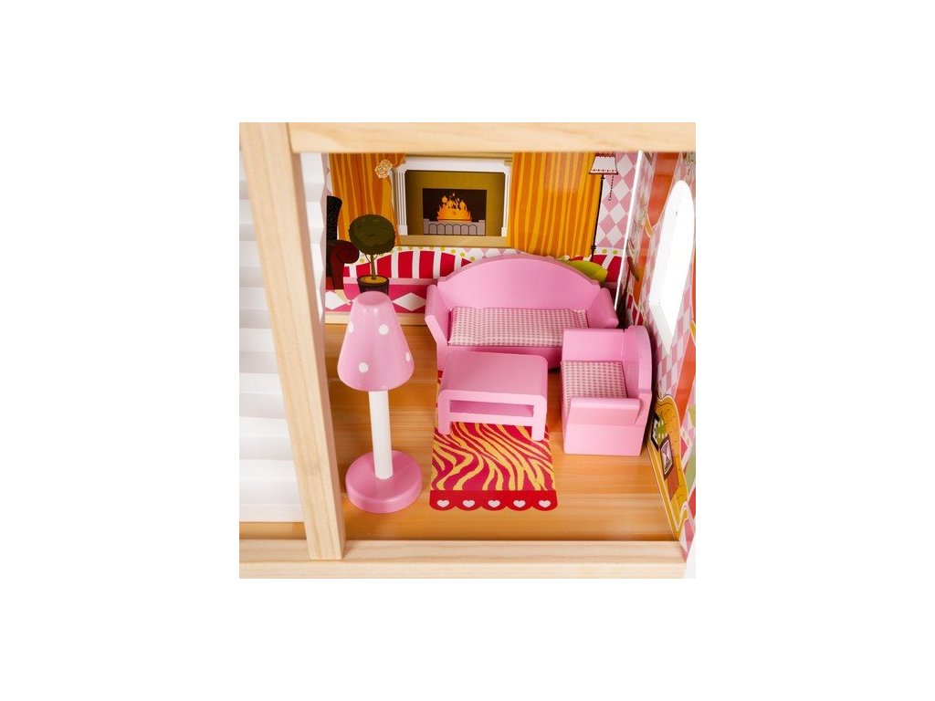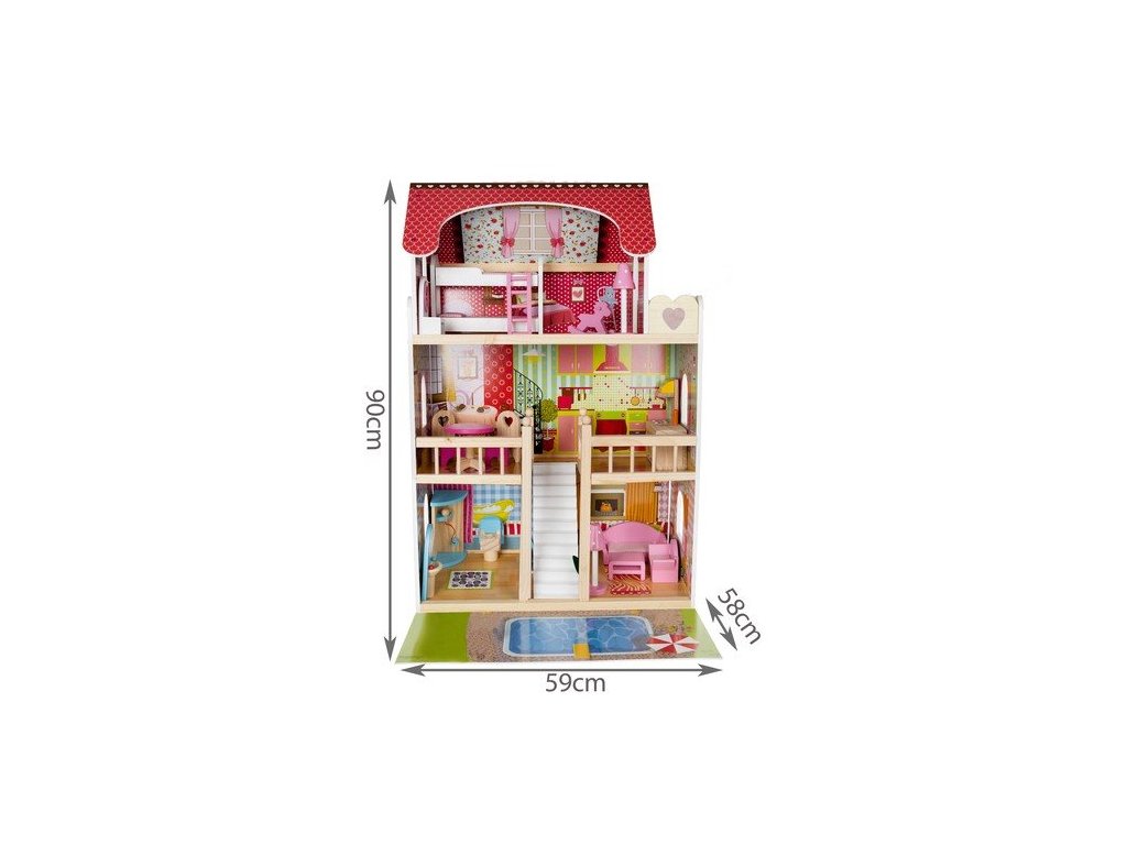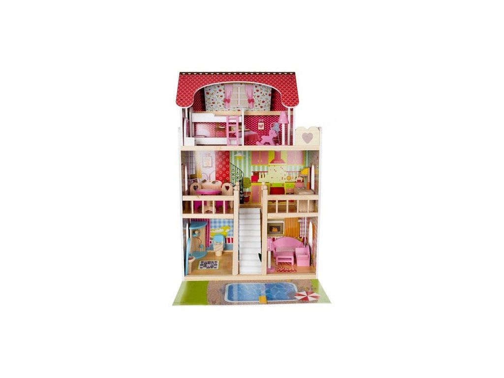 Vlastnosti domečku pro panenky LED s bazénem a příslušenstvím XXL Kruzzel 11251