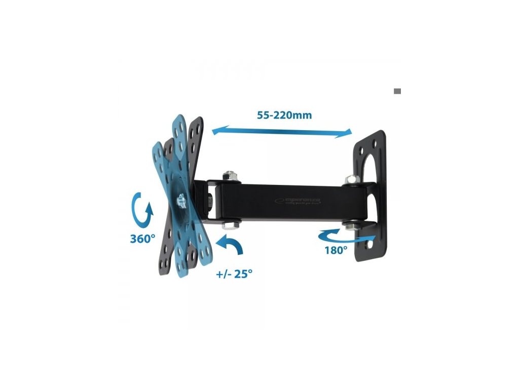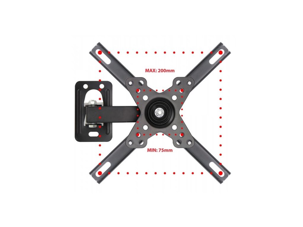 Kovový, pevný nástěnný držák pro TV od 12" do 50". Snadné sestavení. Vyhovuje standardu VESA 75x75 - 200x200. V sadě má malou vodováhu, která pomáhá vyrovnat rukojeť. Držák má možnost nastavení sklonu, horizontálního nastavení úhlu vychýlení a nastavení vzdálenosti televizoru od stěny.