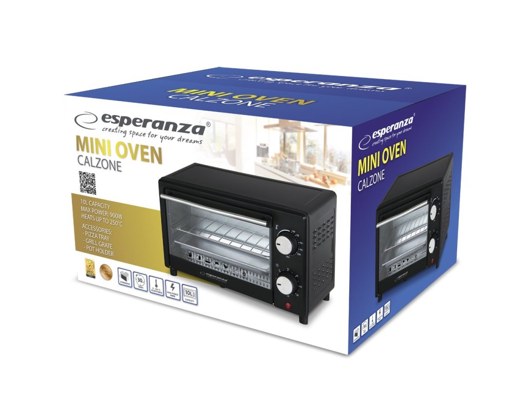 Mini trouba Esperanza CALZONE vám rychle a snadno pomůže udělat lahodnou pizzu, kastrol, hranolky nebo upeče maso či ryby. Spodní část lze snadno a bez zbytečného nepořádku vyčistit, a to díky vestavěnému tácku na drobky. Trouba se vyznačuje pěkným a elegantním designem, díky kterému se bude hodit do každé kuchyně.