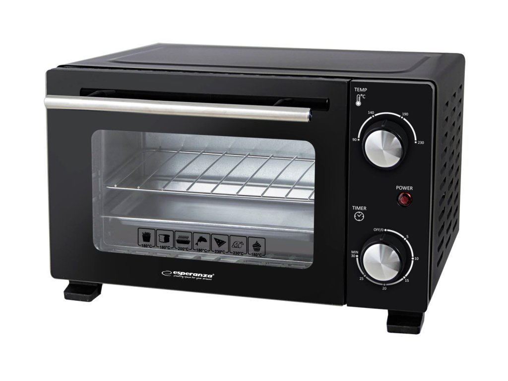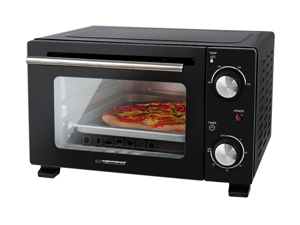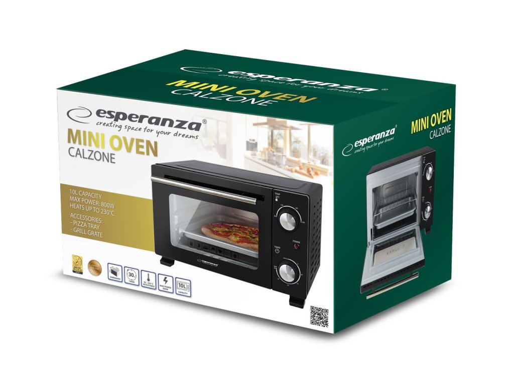 Mini trouba Esperanza CALZONE je kompaktní a praktický spotřebič, který vám umožní rychle a snadno připravit lahodnou pizzu, zapékané pokrmy, hranolky, ale i pečené maso nebo ryby. S výkonem 800 W a objemem 10 litrů je ideální pro menší kuchyně, byty nebo letní domy. Její vysoká energetická účinnost zajišťuje, že trouba dosáhne a udrží požadovanou teplotu rychleji a zároveň spotřebuje méně energie. Model se vyznačuje elegantním designem v kombinaci s praktickými řešeními. Dvojité dveře pokrývající celou přední stranu (se dvěma vrstvami rámu) poskytují lepší tepelnou izolaci, zatímco vzdálenost 23,5 mm mezi vnějším krytem a vnitřním prostorem zlepšuje cirkulaci vzduchu a zvyšuje bezpečnost uživatele.