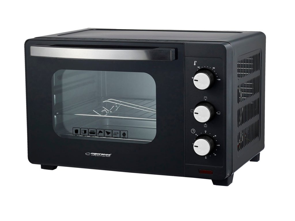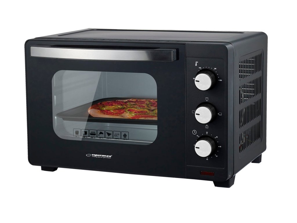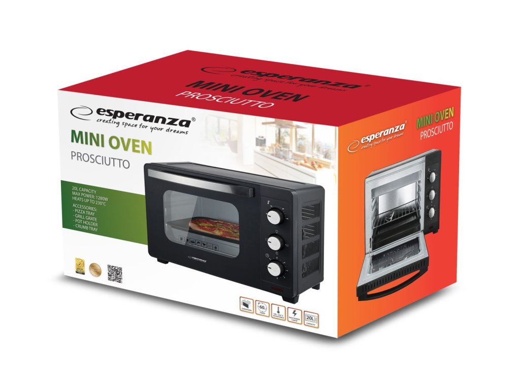Mini trouba Esperanza PROSCIUTTO s objemem 20 litrů je ideální volbou pro ty, kteří hledají kompaktní a energeticky úsporný spotřebič pro každodenní použití. Díky 3 funkcím pečení, nastavitelné teplotě až do 230 °C a 60minutovému časovači si můžete rychle a pohodlně připravit svá oblíbená jídla. Sada obsahuje plech na pizzu, grilovací rošt a chňapku – vše, co potřebujete pro pohodlné vaření doma. Model je vybaven dvojitými tepelně odolnými dvířky z tvrzeného skla (dvě vrstvy rámu), které poskytují lepší tepelnou izolaci a zvýšenou bezpečnost uživatele. Vzdálenost 54,1 mm mezi vnějším krytem a vnitřní dutinou navíc vytváří více prostoru a zlepšuje odvod tepla. Trouba váží 6,1 kg, což zajišťuje pevnou konstrukci a stabilitu během používání.