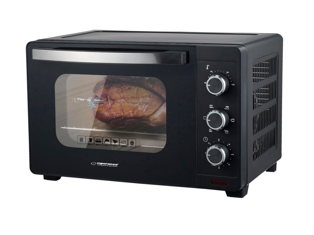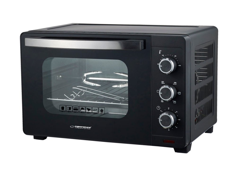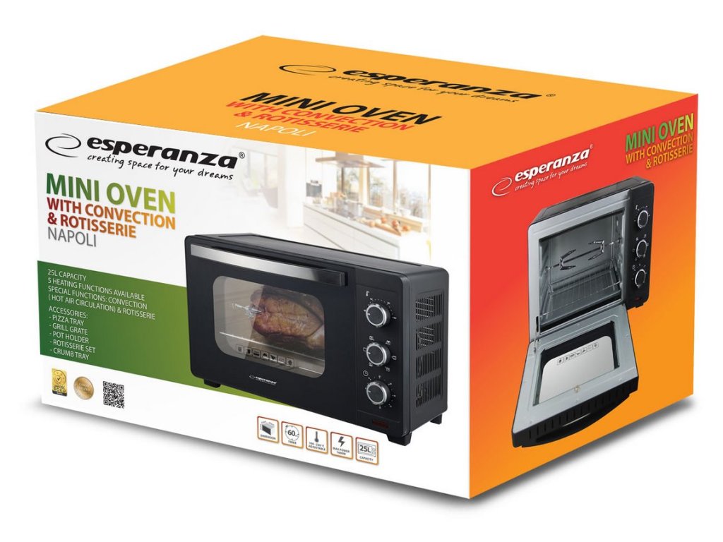 Mini trouba Esperanza NAPOLI kombinuje funkčnost s kompaktní velikostí a nabízí 5 režimů pečení, funkci konvekce a vestavěný rožeň. S objemem 25 litrů a výkonem 1600 W je ideální pro každodenní vaření, pečení pizzy, opékání masa nebo grilování zeleniny. Přesné ovládací knoflíky umožňují nastavit teplotu až na 230 °C a dobu pečení až 60 minut. Sada obsahuje plech na pizzu, grilovací rošt, chňapku a kompletní sadu pro rožeň – vše, co potřebujete pro pohodlné domácí vaření.Kompaktní velikost, maximální výkon