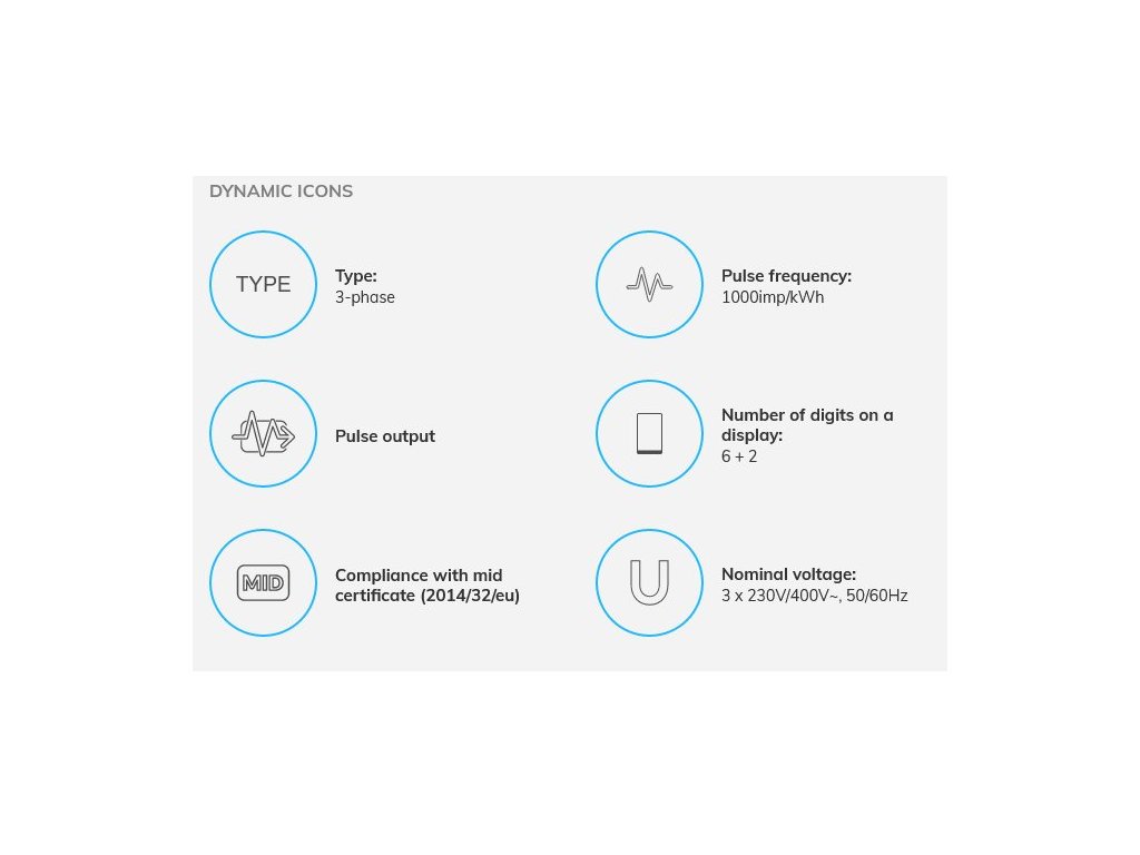 Tento digitální elektroměr je určen pro všechny, kteří potřebují spolehlivě měřit spotřebu elektrické energie v třífázových systémech. Jeho robustní konstrukce a moderní elektronický systém umožňují přesné měření v metrických jednotkách (kWh) a generování impulzů úměrně spotřebované energii. Měření probíhá v souladu s normami EN50470-1:2006 a EN50470-3:2006, díky čemuž splňuje i požadavky směrnice MID 2014/32/EU.