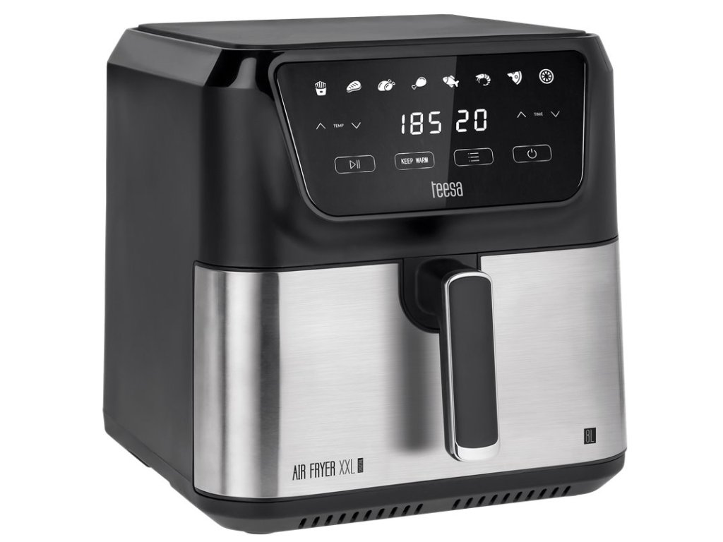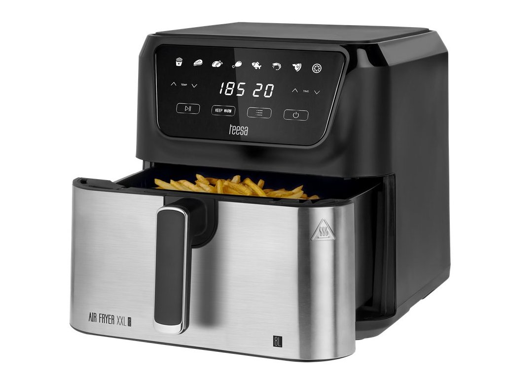 Horkovzdušná fritéza TEESA DIGITAL AIR FRYER XXL s objemem 8L a výkonem 1700W nabízí zdravé vaření s minimem tuku. 8 automatických programů zajistí dokonalé výsledky pro každé jídlo.