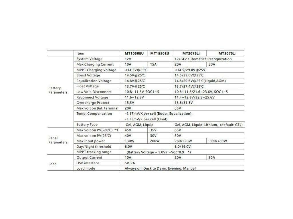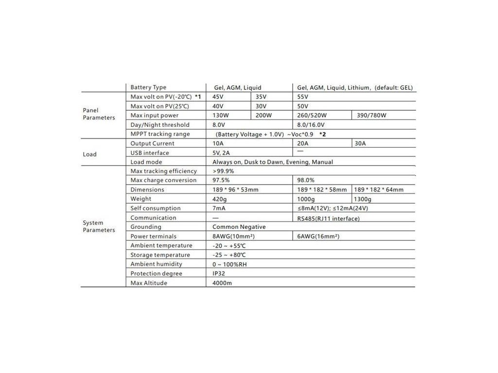 - Maximální výkon FV panelů: 390W (12V) nebo 780W (24V)