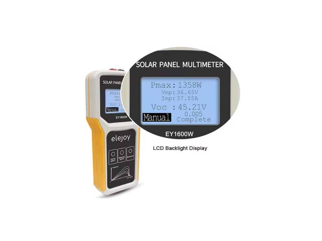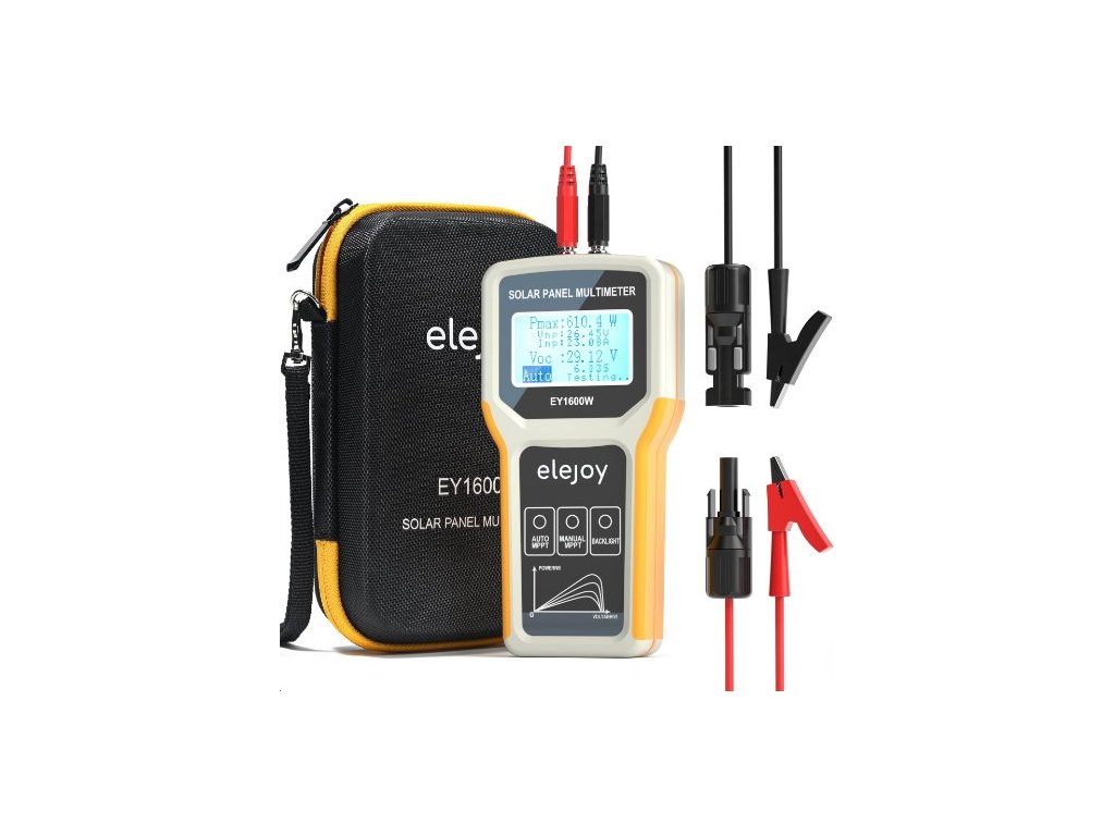 ELEJOY EY-1600W je kompaktní a výkonný tester určený pro měření výkonu solárních panelů až do 1600 W. Umožňuje rychlé a přesné měření napětí, proudu, výkonu i VOC (napětí naprázdno) v reálném čase. Díky technologii MPPT, velkému podsvícenému LCD displeji a napájení přímo ze solárního panelu je ideální pro techniky, montéry i domácí uživatele.