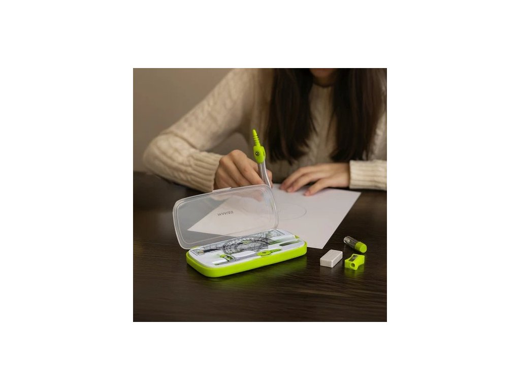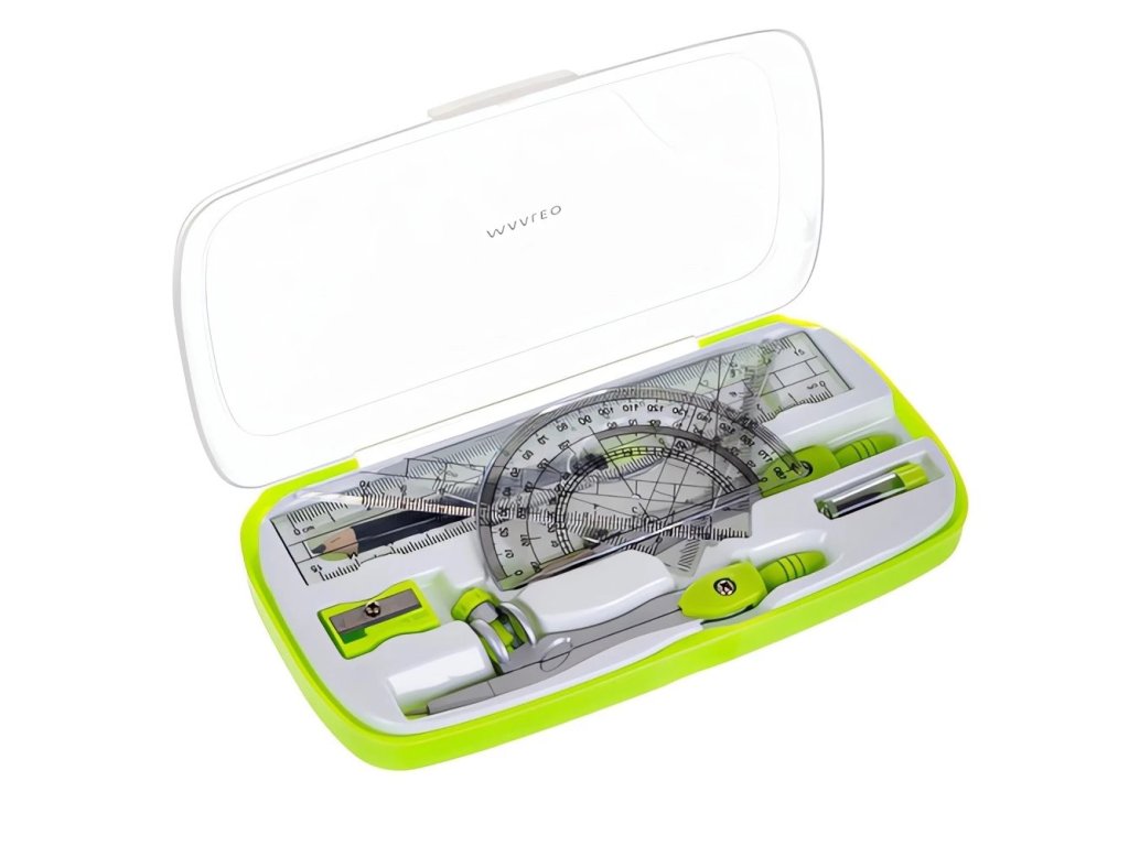 Kompletní geometrická sada je ideální pomůcka pro školáky, studenty i profesionály. Obsahuje vše potřebné pro přesné rýsování, měření i konstrukci geometrických útvarů. Praktické plastové pouzdro s průhledným víkem zajistí přehlednost a snadné přenášení. Moderní design v kombinaci zelené a bílé barvy zaručí, že se tato sada neztratí ani v přeplněné školní tašce.