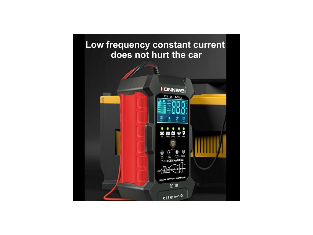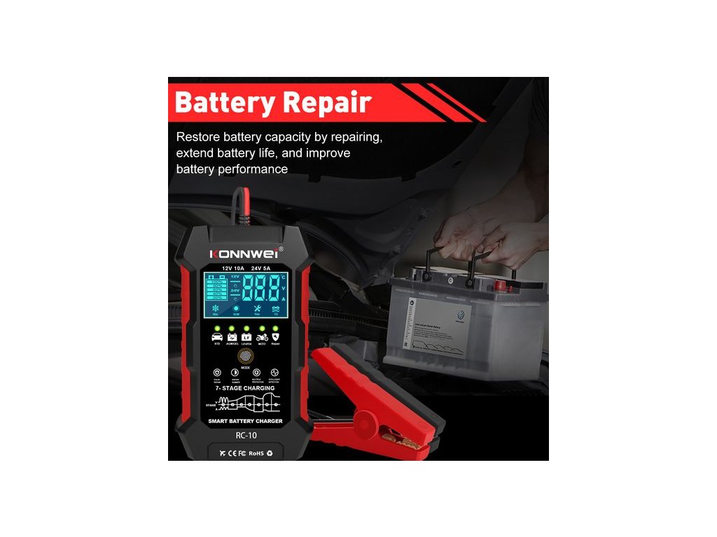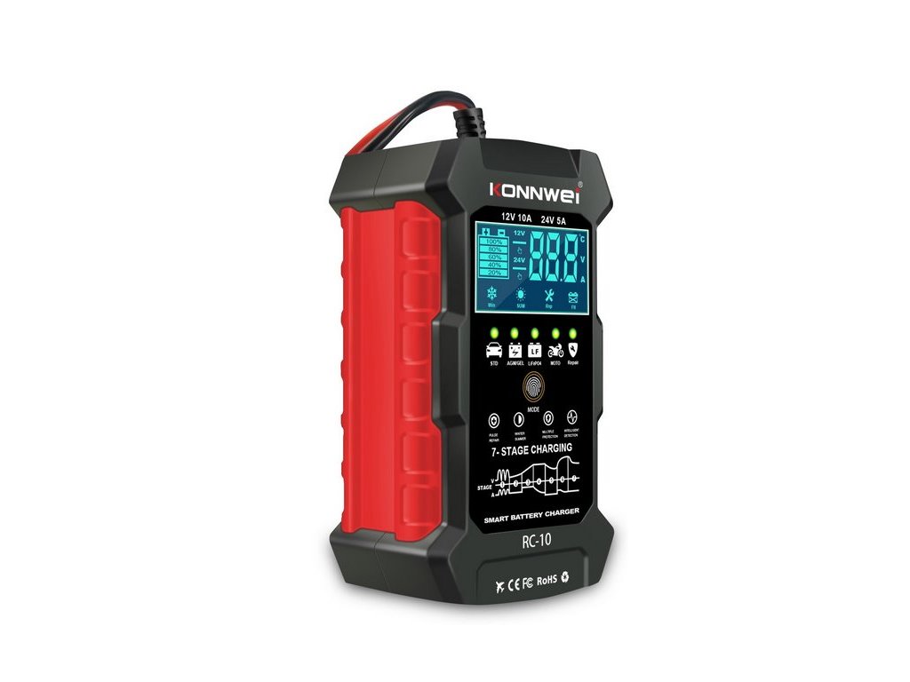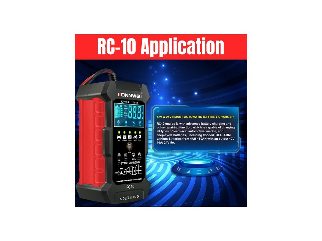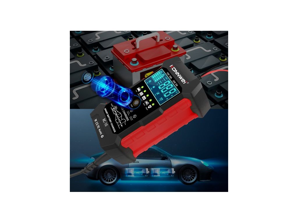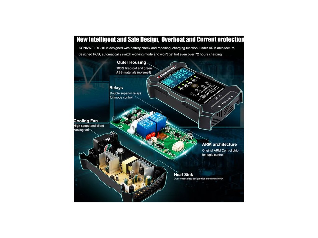 Inteligentní nabíječka akumulátorů KONNWEI RC-10 s funkcí desulface nabízí široký rozsah nabíjecího napětí 12-24 V a podporuje různé typy baterií, včetně AGM a LiFePO4.