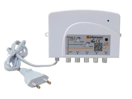 Domovní zesilovač Johansson 7722L2 nabízí širokopásmovou podporu s regulací zisku pro VHF/UHF a 5G LTE, ideální pro rodinné domy i více bytové jednotky.