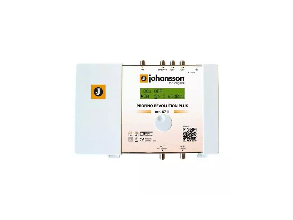 Programovatelný anténní zesilovač Johansson Profino Revolution 6711 je určený pro rozvody STA, ITR. Zesilovač disponuje čtyřmi vstupy : FM + 1x VHF/DAB + 2 x UHF. Zesilovač sám detekuje nejvyšší TV kanál připojený do vstupu a podle toho zařazuje vstupní filtr typu horní zádrž pro omezení rušení v pásmu 5G, 4G (LTE) nebo je filtr vypnut při příjmu TV kanálů nad 790 MHz. Zesilovač automaticky načte a zobrazí úroveň signálu zvoleného TV kanálu, to znamená, že při nastavování nepotřebujete měřicí přístroj. Zesilovač umožňuje kmitočtovou konverzi jakéhokoliv vstupního TV kanálu v pásmech VHF a UHF na jakýkoliv jiný TV kanál v pásmech VHF a UHF, což je výhodné pro různé hotely a penzióny, kde mají rozsáhlé rozvody na vysokých kmitočtech velký útlum. V jednotlivých TV kanálech (nebo klastrech) je automaticky v reálném čase (do 20 vteřin) regulována úroveň signálu pomocí AGC, tak aby na výstupu zesilovače byly úrovně konstantní. Zesilovač umožňuje zpracovat více než 50TV kanálů v 15ti klastrech (filtrech), každý klastr může přenášet 1, 2, 3, 4, nebo 5 multiplexů. Pokud požadujeme konverzi kmitočtu, můžou být v klastru 1, 2, nebo 3 TV kanály. Například můžeme konvertovat skupinu kanálů 21, 22, 23 na skupinu kanálů 31, 32, 33. Do vstupů DAB/VHF a UHF zesilovače je možné připojit předzesilovače, pak je nutno v Menu zapnout nápájení předzesilovače +12 nebo +24V, součet proudového odběru nesmí převýšit 100mA. Nastavení celého modulu zesilovače je možné uzamknou heslem proti neoprávněným změnám. Jednodušší a cenově dostupnější varianta oblíbeného zesilovače Johansson Profiler Revolution 6700.