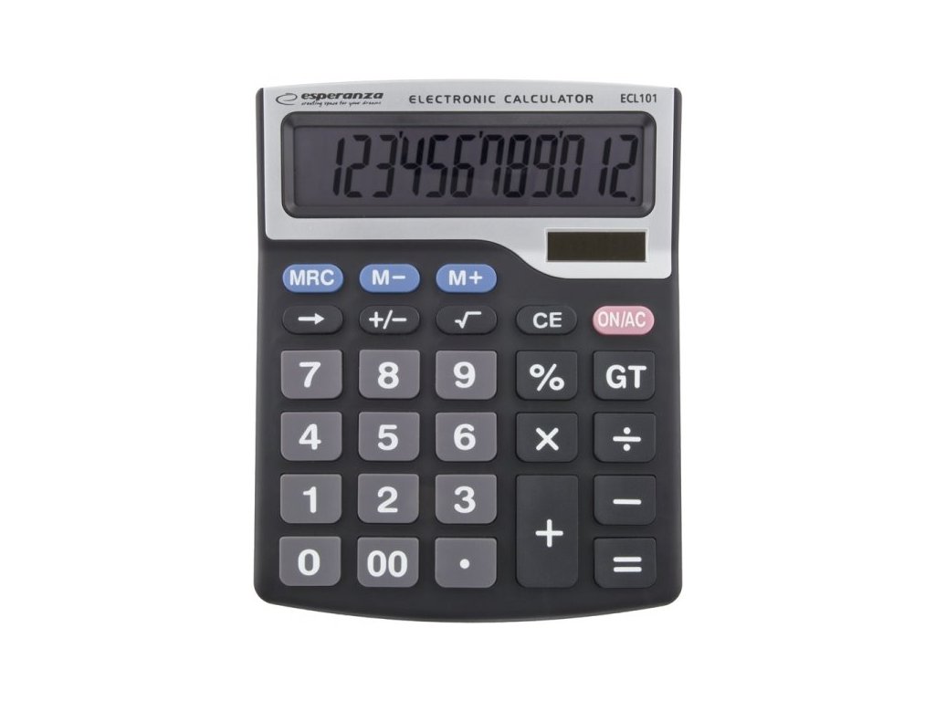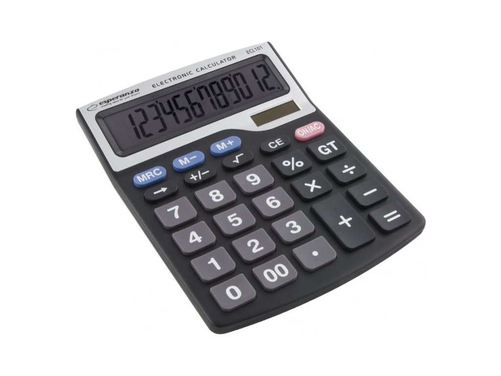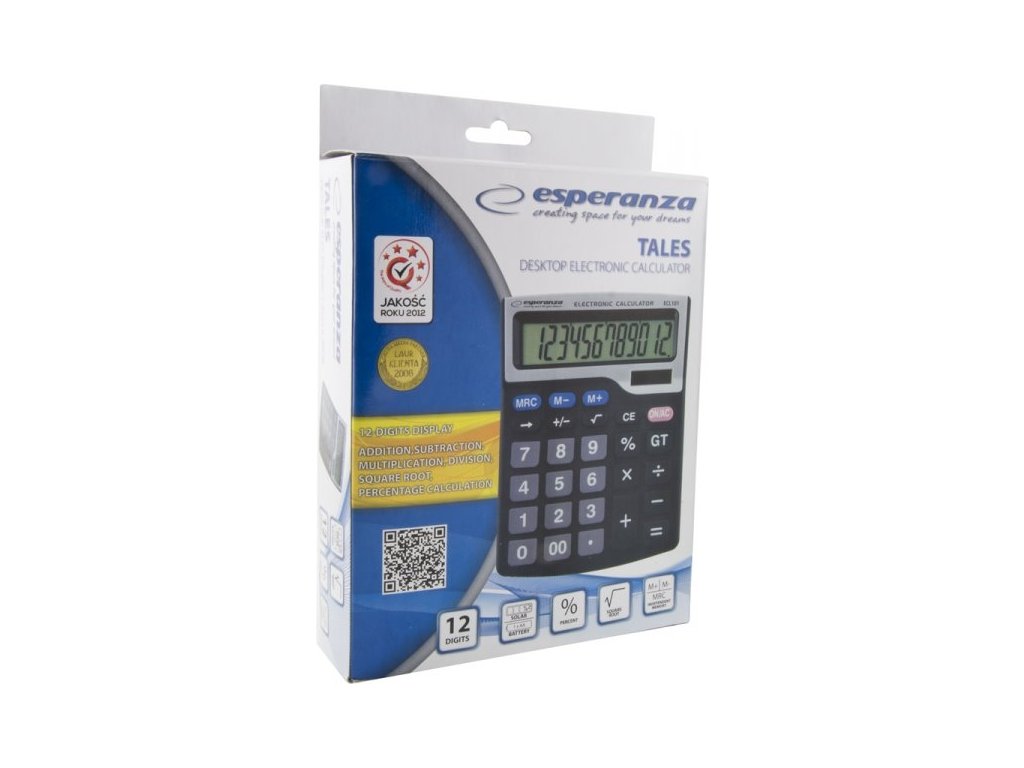 Elektronická stolní kalkulačka Esperanza TALES s velkým 12místným displejem. Obsahuje všechny základní matematické funkce, funkci korekce číslic a možnost ukládat výsledky. Díky nakloněnému displeji, velkým viditelným číslicím a velkým tlačítkům je práce s kalkulačkou snadná a pohodlná. Ideální pro každodenní použití v obchodech, kancelářích nebo doma.