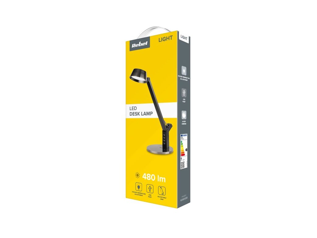 Kancelářská LED stolní lampa REBEL KOM1008 nabízí 3 barvy světla a nastavitelnou intenzitu v 8 krocích. S výkonem 7 W a USB portem pro nabíjení externích zařízení je ideálním doplňkem pro vaši pracovnu.