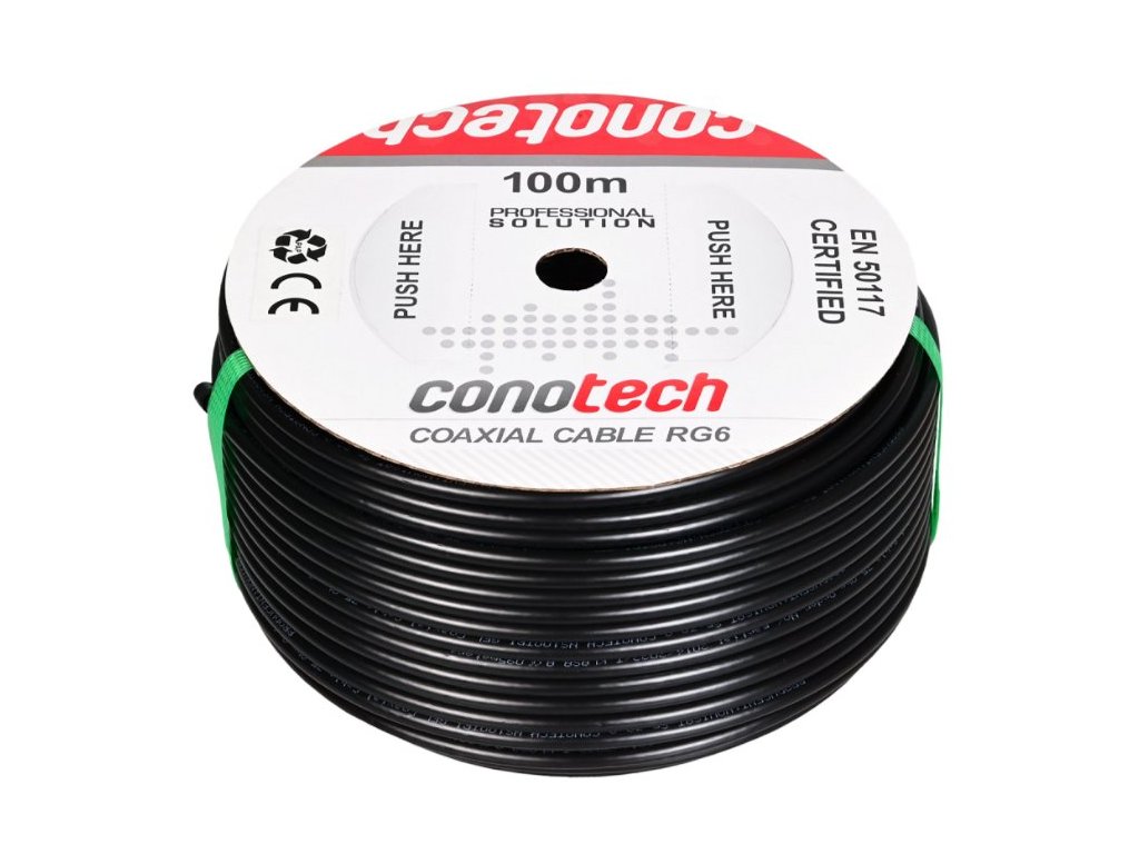 Koaxiální kabel CONO-TECH RG6 NS CB113 HQ Gel, 1,13mm CU, Trishield, PE, 6,8mm, 100m černý