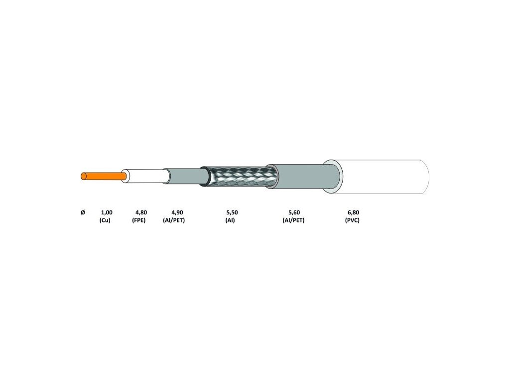 Vysoce kvalitní, trojitě stíněný koaxiální kabel typu RG6, s vnitřním vodičem z měděného drátu o průměru 1,00 mm.