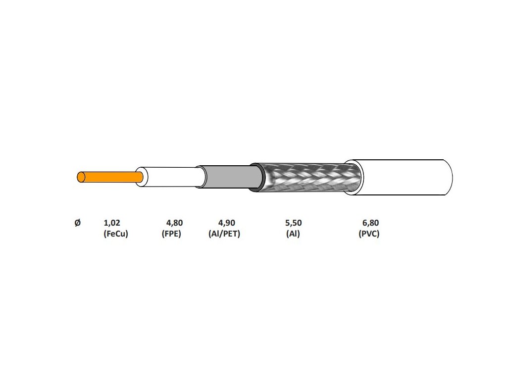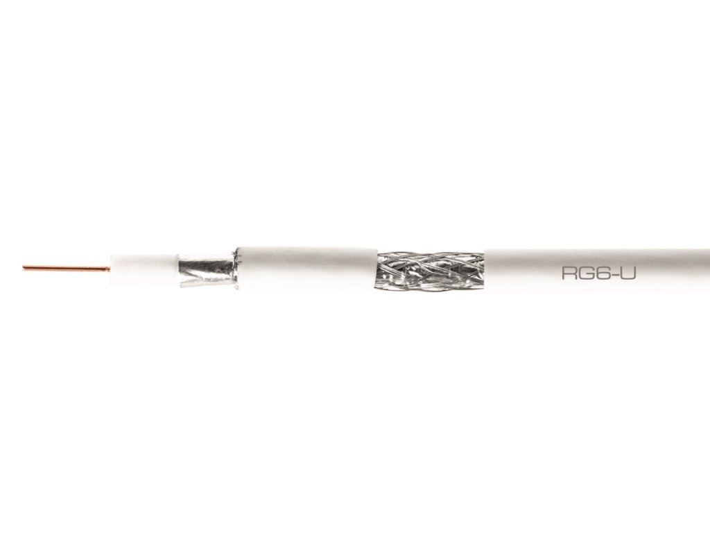 Dvojitě stíněný koaxiální kabel RG6 s vnitřním vodičem z poměděného ocelového drátu o průměru 1,02 mm.