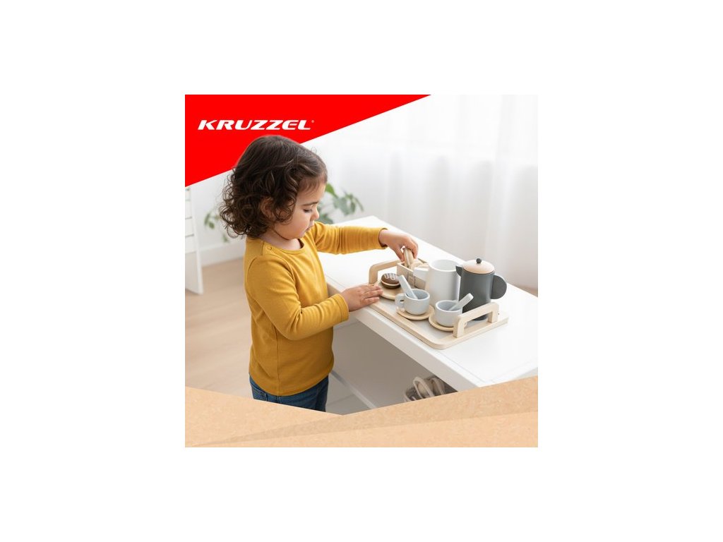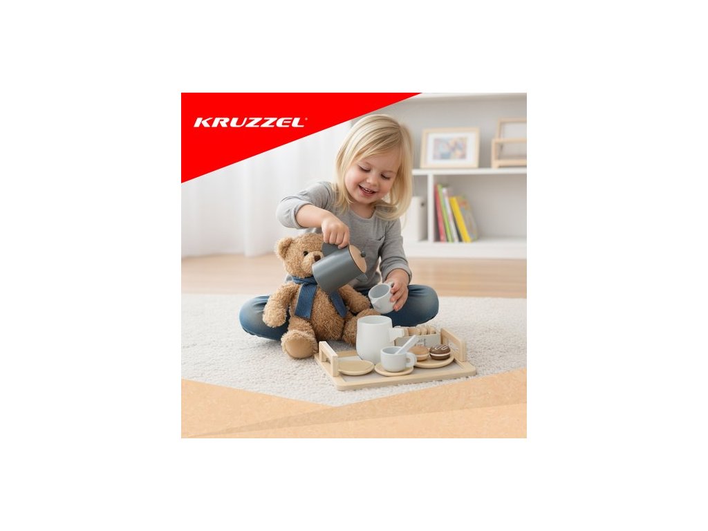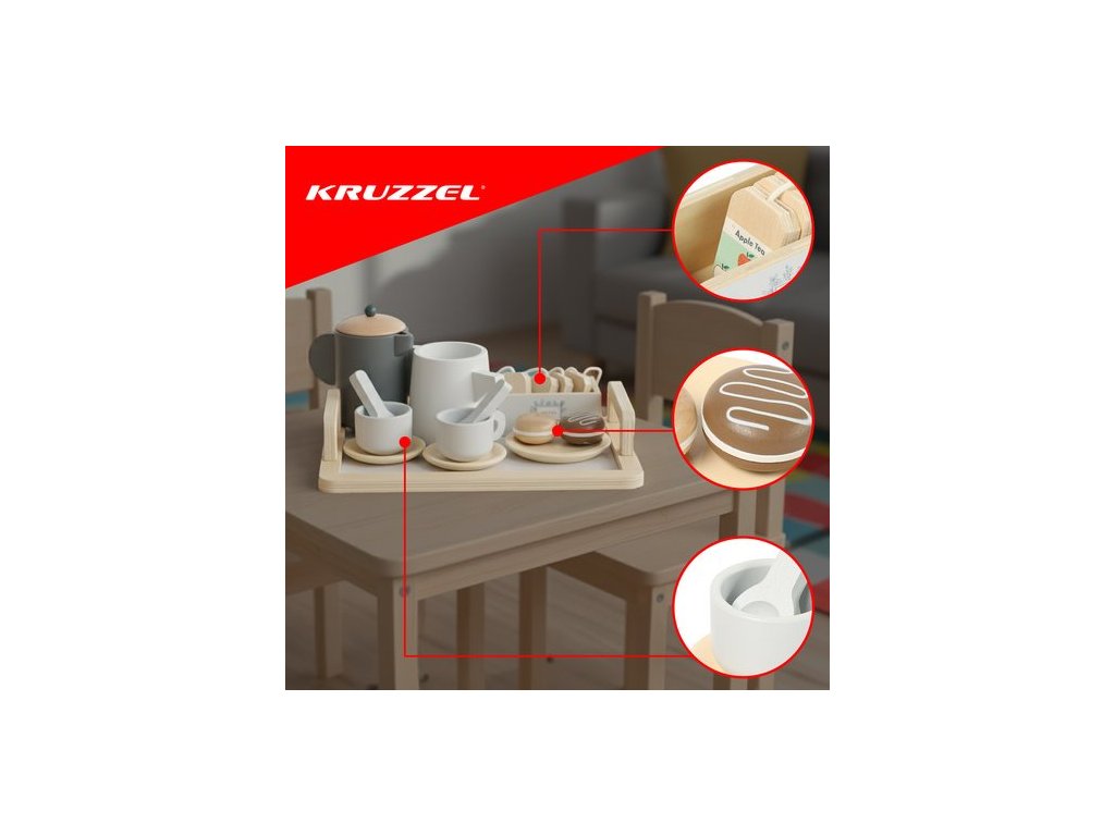 Dřevěná čajová sada KRUZZEL je elegantní, pečlivě vyrobená hračka pro děti od 3 let. Promění každodenní hraní v kreativní párty a domácí hraní rolí. Přírodní materiály, pastelové barvy a bohatá sada doplňků dělají z této sady radost jak pro děti, tak pro rodiče. Podporuje rozvoj, rozvíjí samostatnost a přináší spoustu radosti.
