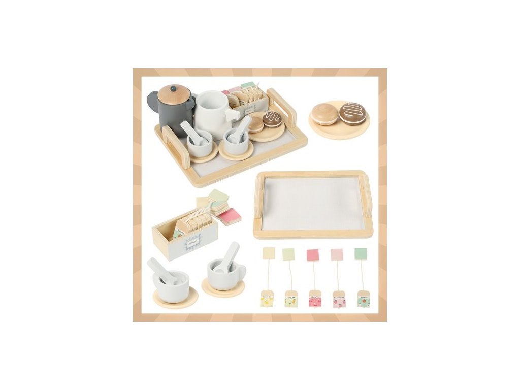 Dřevěná čajová souprava Kruzzel - dětská kuchyňská sada - tác, konvice, hrnky, lžičky, makronky - hrací doplňky - bezpečné dřevo - perfektní dárek