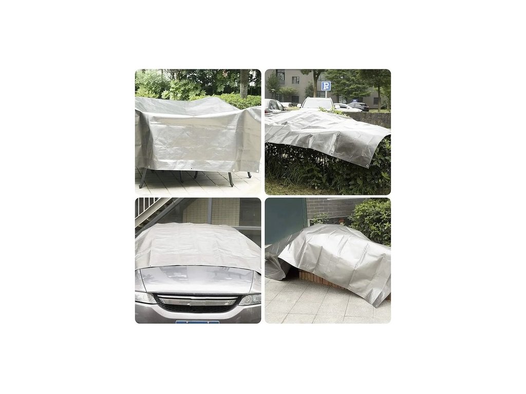 SPECIFIKACE - barva: stříbrná; materiál: HDPE, PP, nerezová ocel; gramáž: 120g/m2; typ: PLS3X4; povlak: LDPE; zesílené okraje: ano; počet otvorů: 14; průměr otvoru: 12 mm; rozměry: 3 x 4 m; hmotnost: 1,54 kg; hmotnost v balení: 1,55 kg.