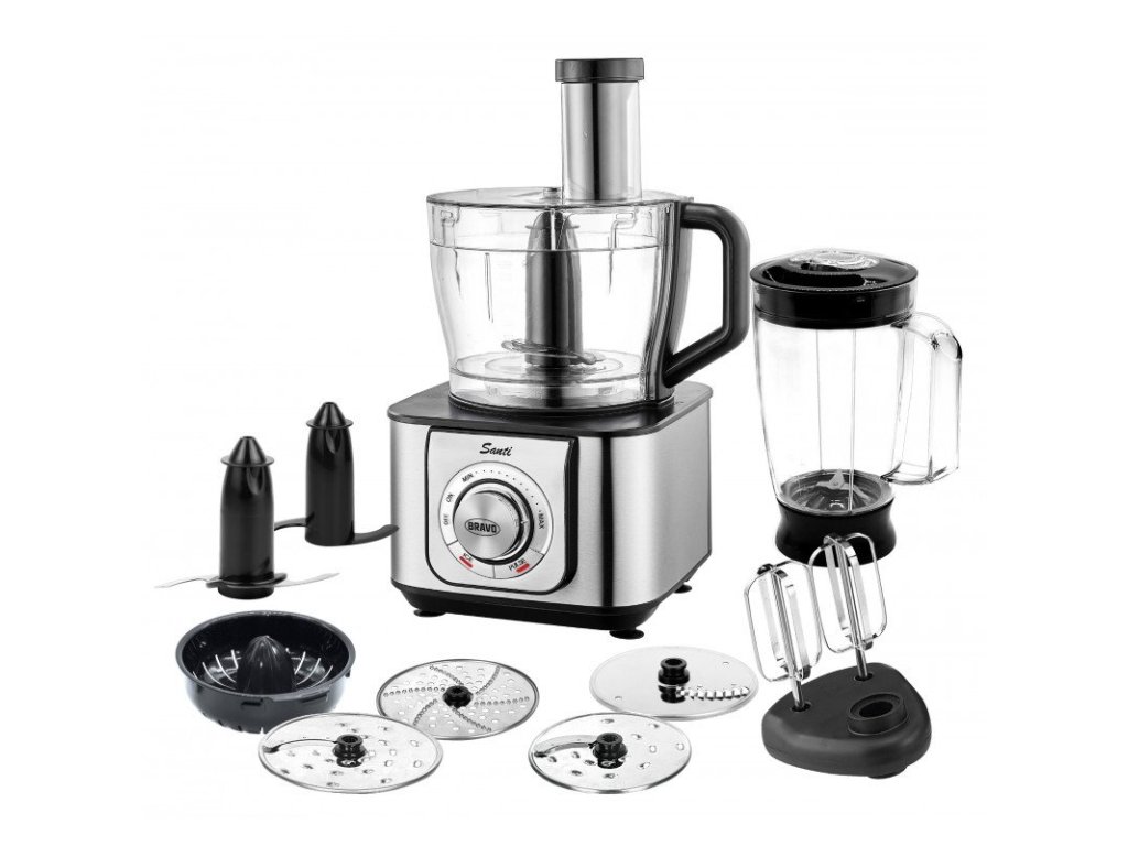 Multifunkční kuchyňský robot s příkonem Santi B-4696 s příkonem 1200 W a nádobou o objemu 1,5 litru. Vybaven 2 rychlostmi a pulzním režimem, které zvládnou drcení, sekání, míchání i výrobu těsta.