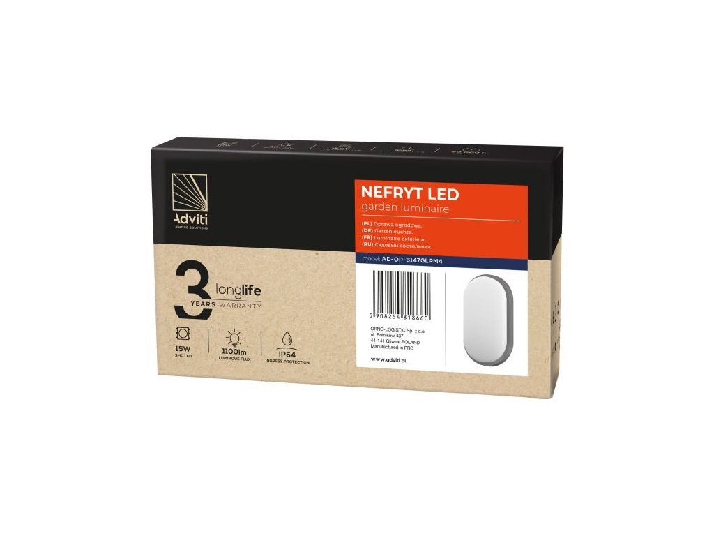 LED Venkovní svítidlo ORNO AD-OP-6147GLPM4 NEFRYT s výkonem 15W a světelným tokem 1100 lm poskytuje přirozené bílé světlo o teplotě 4000K a krytím IP54. Ideální pro osvětlení vchodů, teras a zahradních altánů.