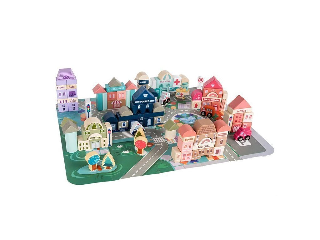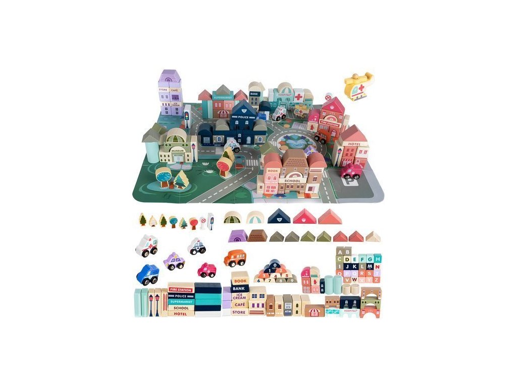 Montessori dřevěné kostky s podložkou - město ISO 11228 jsou ideální pro rozvoj manuální zručnosti a kreativity. Děti si užijí nekonečné možnosti hraní s 115 bloky a 20 dílky puzzle.