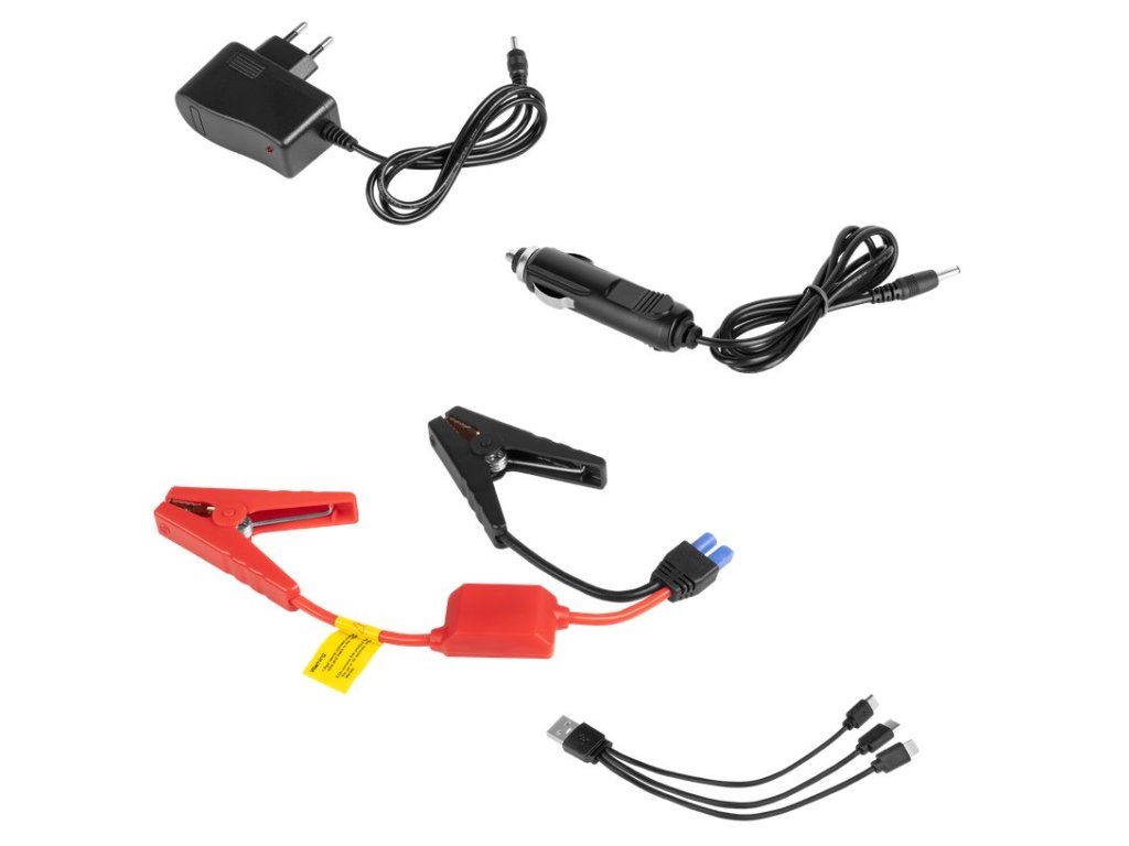 - Funkce 3 v 1: Nabíjení smartphonů (micro USB, USB-C, Lightning) a startování vozidel.
