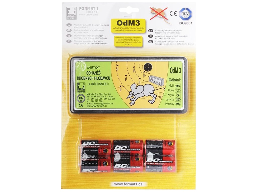 Elektronický akustický plašič FORMAT1 OdM3 hlodavců s přerušovaným zvukem proti drobným hlodavcům jako jsou například myší, kuny, potkani, krysy, lasičky, tchoři a další škůdci. Elektrický kunoplaš OdM3 je možné napájet jak sadou baterií R14 (malé monočlánky typu "C") nebo síťovým zdrojem do zásuvky sítě 230V.