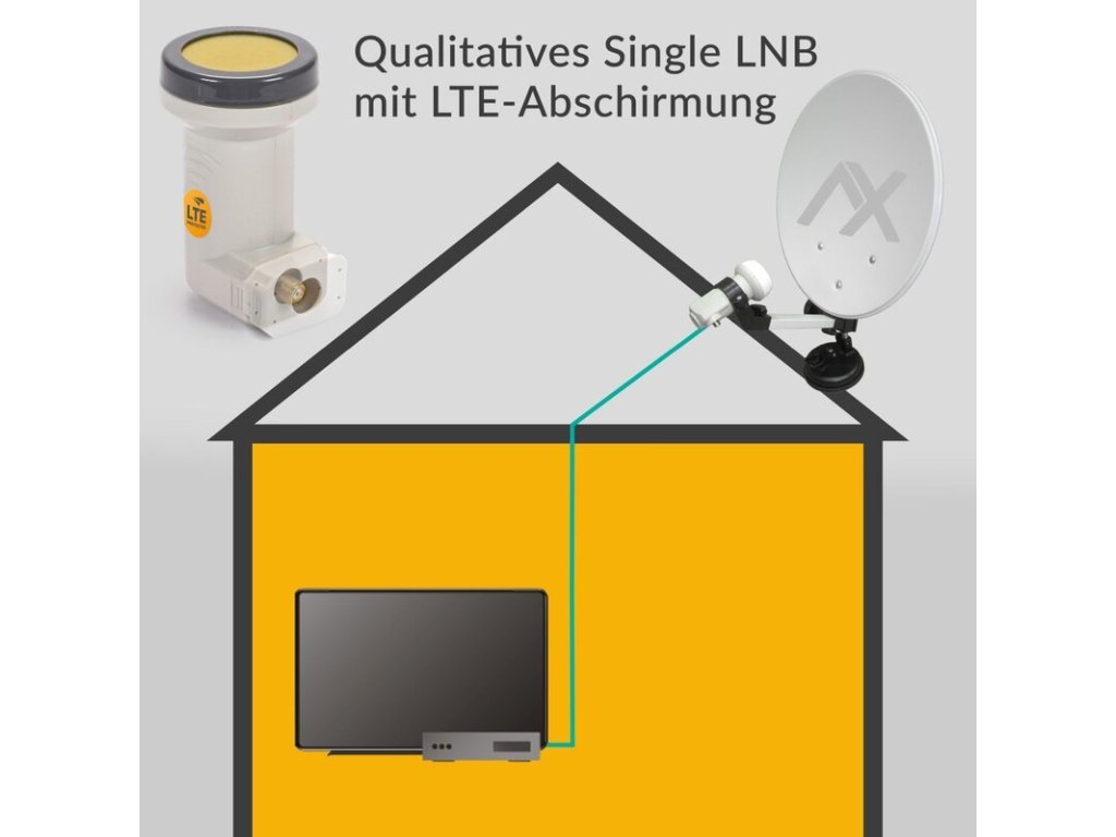 PŘÍJEM: Vysoce kvalitní LNB s LTE filtrem a šumovým číslem pouze 0,1dB. Ani za špatných povětrnostních podmínek vás AX LNB nezklame. Patentovaná krytka Sun Protect LNB je extrémně odolná vůči teplu (-35 °C ~ 70 °C)
