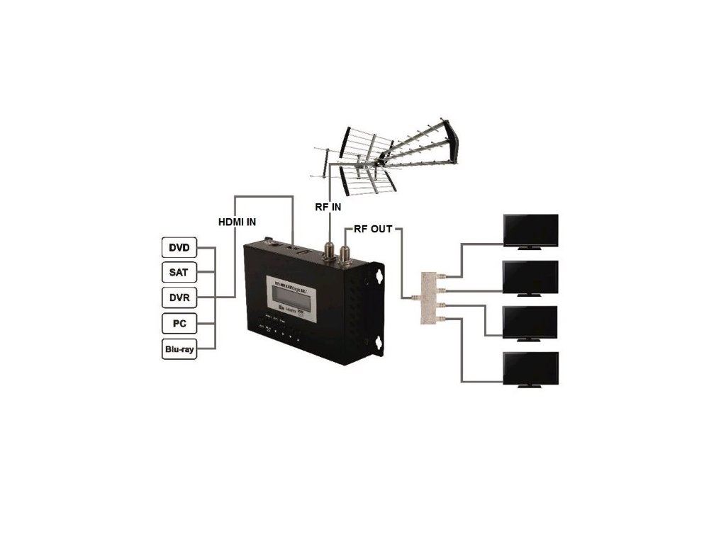 - RF IN vstup: Umožňuje připojení DVB-T antény a sloučení TV vysílání se signálem HDMI do distribuční sítě.