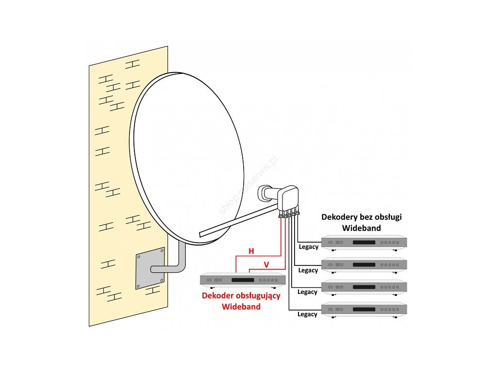 Širokopásmové výstupy mají celé satelitní pásmo (10,7-12,75 GHz) po převodu na mezilehlé pásmo 290-2340 MHz;
