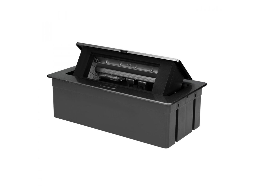 Prázdné hliníkové pouzdro, které lze zasunout do stolu, pouzdro se skládá z prázdné hliníkové kazety a integrovaného rámu z PVC. Toto univerzální řešení umožňuje instalaci 3 modulárních zásuvek o rozměrech 45x45 mm nebo 6 zásuvek o rozměrech 22,5x45 mm (síťová zásuvka, HDMI, USB, RJ45, RJ11) v konfiguraci podle přání uživatele. Zařízení je určeno pro instalaci do stolů, pracovních desek nebo konferenčních místností. U pouzdra je k dispozici kabel o délce 1.5m.