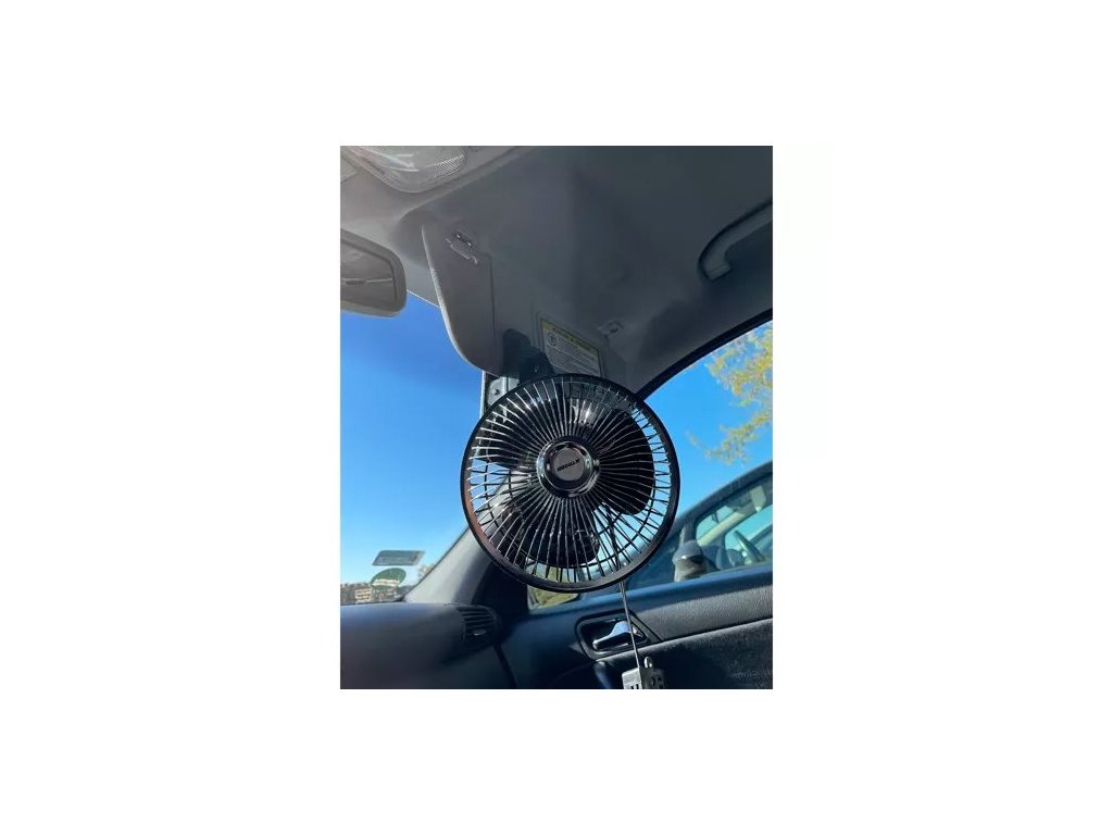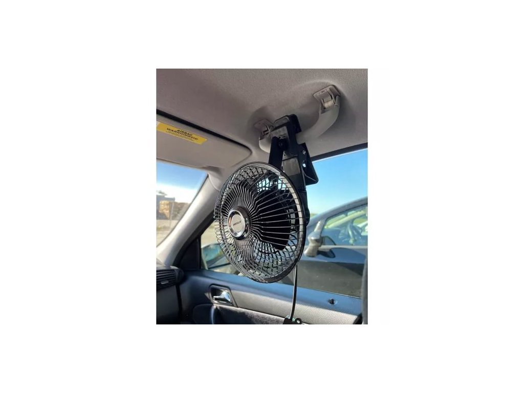 INSTALACE KLIPU - díky základně s klipem lze ventilátor snadno připevnit na různá místa v autě, což zajišťuje stabilitu při jízdě. Ventilátor je velký, ale způsob montáže a nízká hmotnost umožňují snadné přenášení a montáž v různých vozidlech a také skladování, když se nepoužívá.