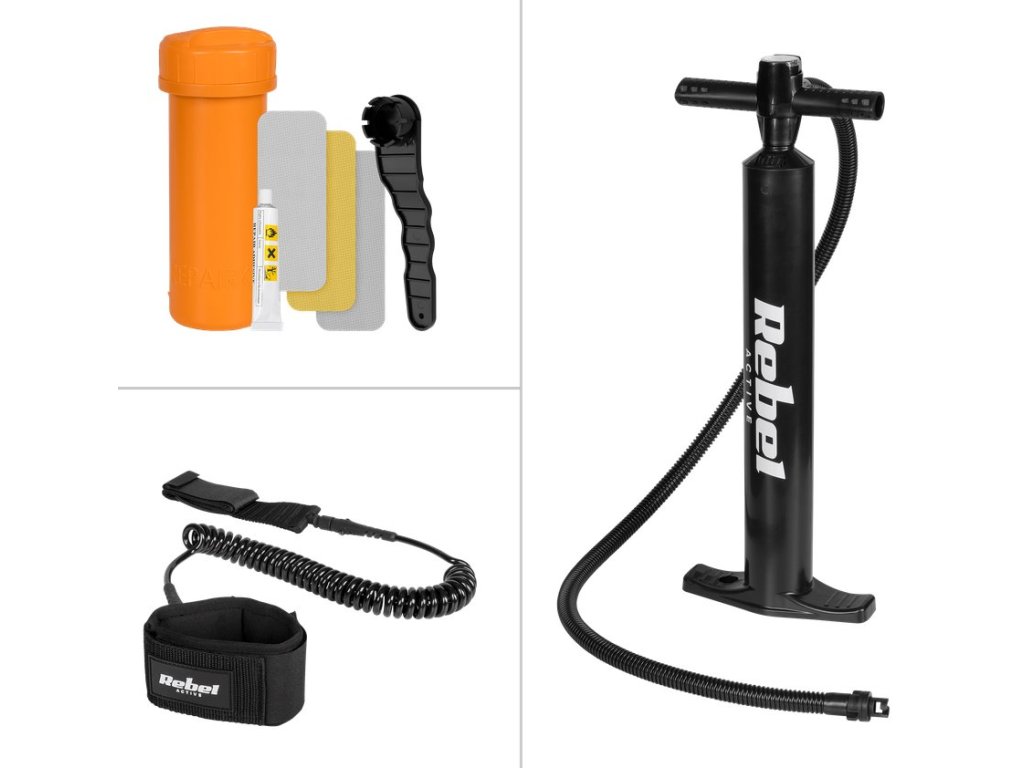 Plachta RBA-4513 SUP je dodávána s ruční pumpou s tlakoměrem, která umožňuje rychlé a efektivní nafouknutí. Prkno je navíc dodáváno s opravnou sadou, která obsahuje klíč na ventilek, tři opravné záplaty a lepidlo, takže můžete rychle opravit jakékoli problémy a vrátit se k pádlování!