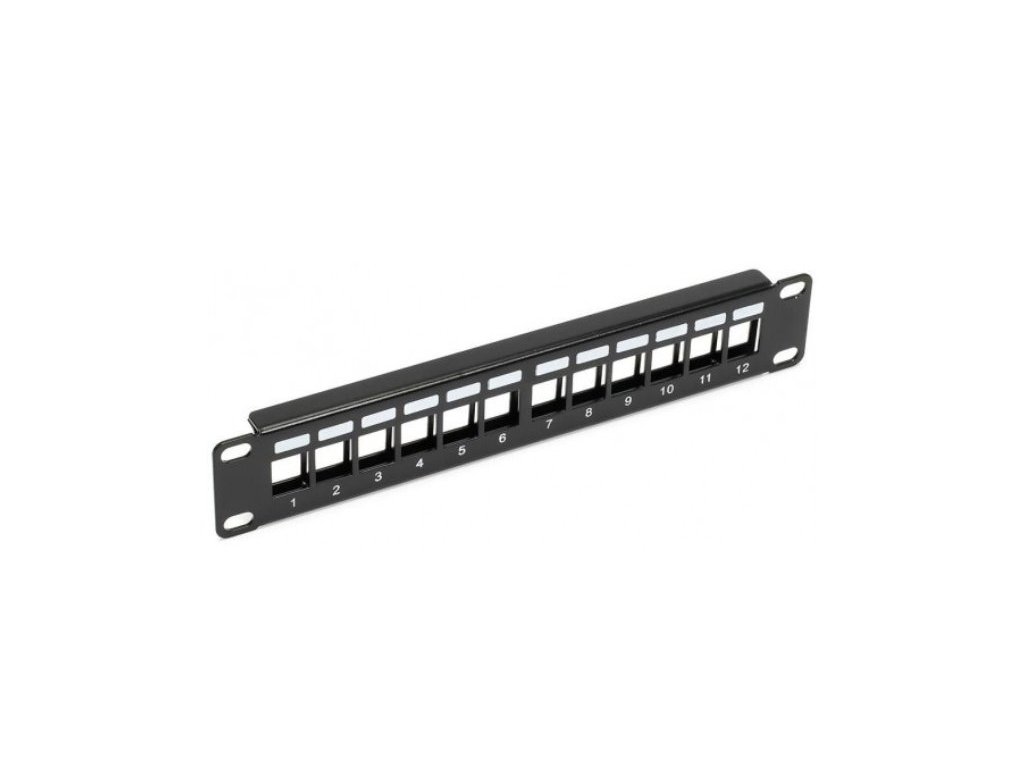 Patch panel s **12 porty** pro snadnou instalaci a organizaci kabeláže. Vhodný pro montáž do **10" datových rozvaděčů**.