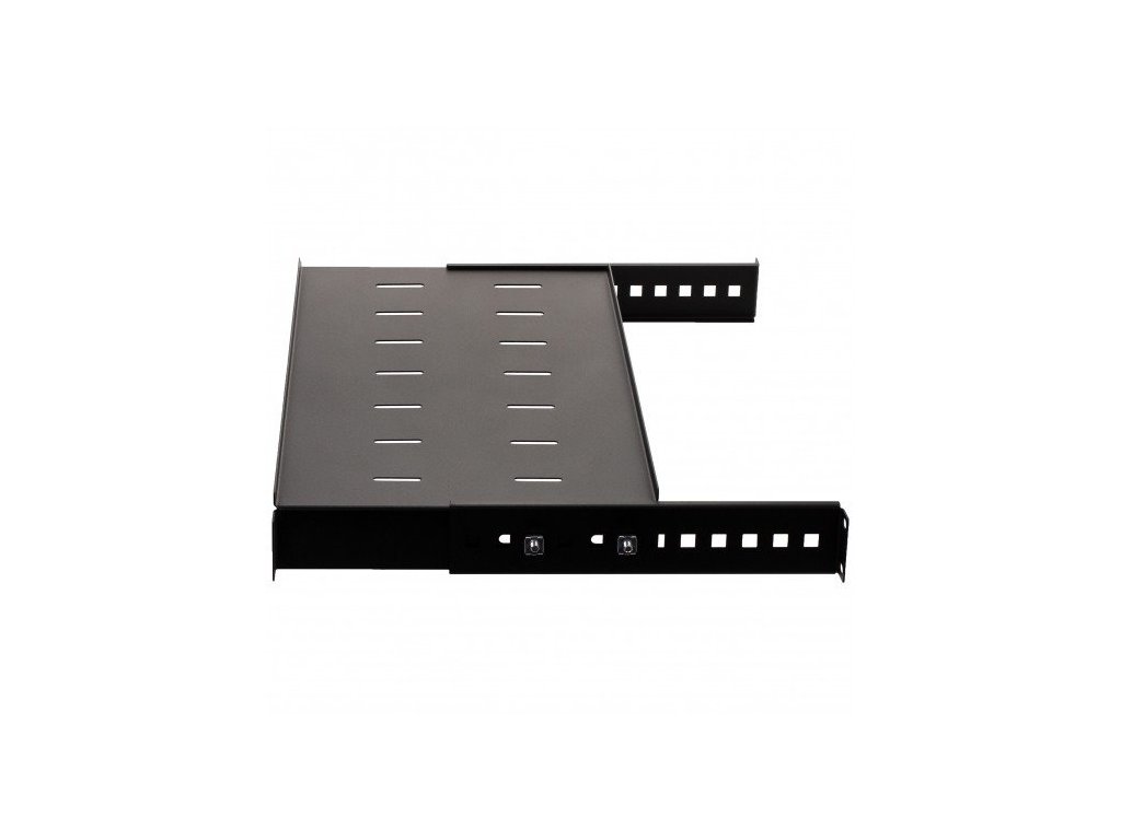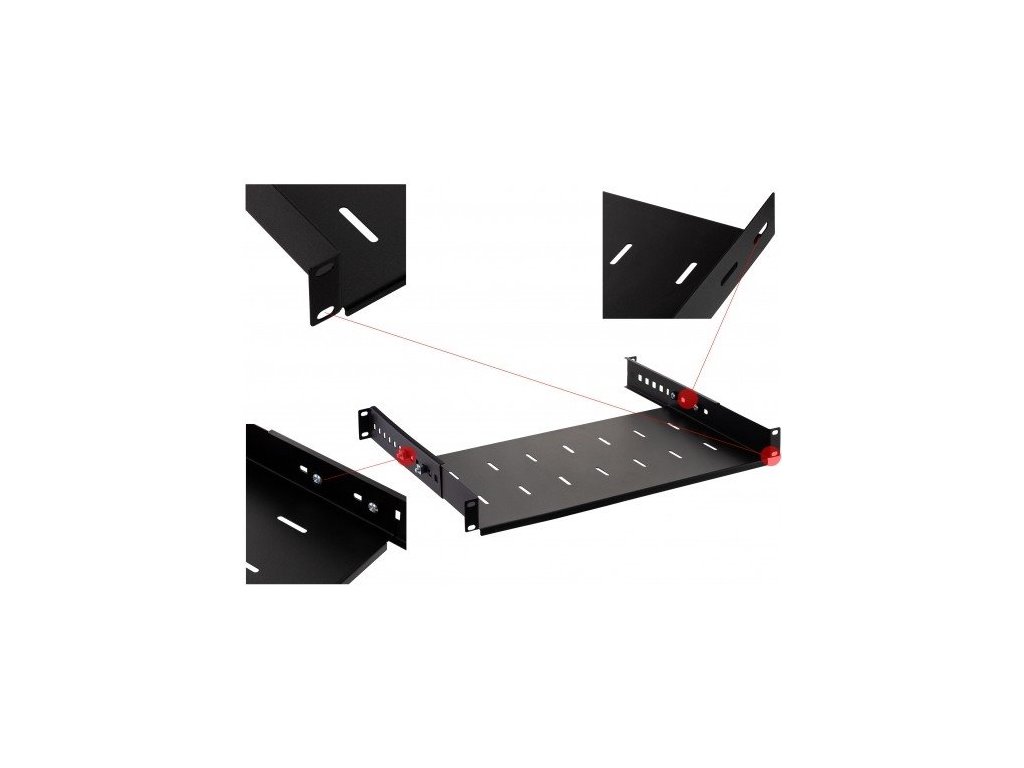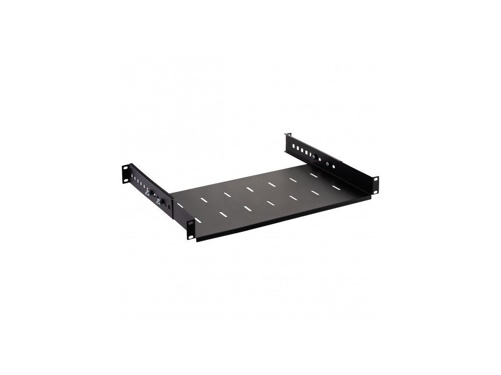 Nastavitelná police NEKU 19" 1U 250mm černá nabízí nosnost až 35 kg a možnost přizpůsobení hloubky pro optimální využití ve skříních. Ideální pro umístění těžkých zařízení s důrazem na snadnou montáž a odvod tepla.