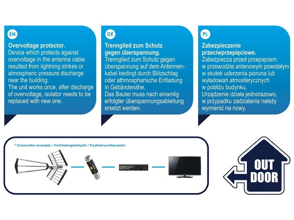 Přepěťová ochrana bleskojistka Opticum AX ISOLATOR TV/FM/SAT je nezbytným prvkem pro všechny majitele televizních a satelitních zařízení, kteří chtějí zajistit jejich dlouhou životnost a bezproblémové fungování. Tento produkt je navržen tak, aby chránil vaše zařízení před přepětím, které může vzniknout v důsledku přímého úderu blesku. Ochranné zařízení je určeno pro SAT i TV příjem, a to jak v interiérech, tak i exteriérech.